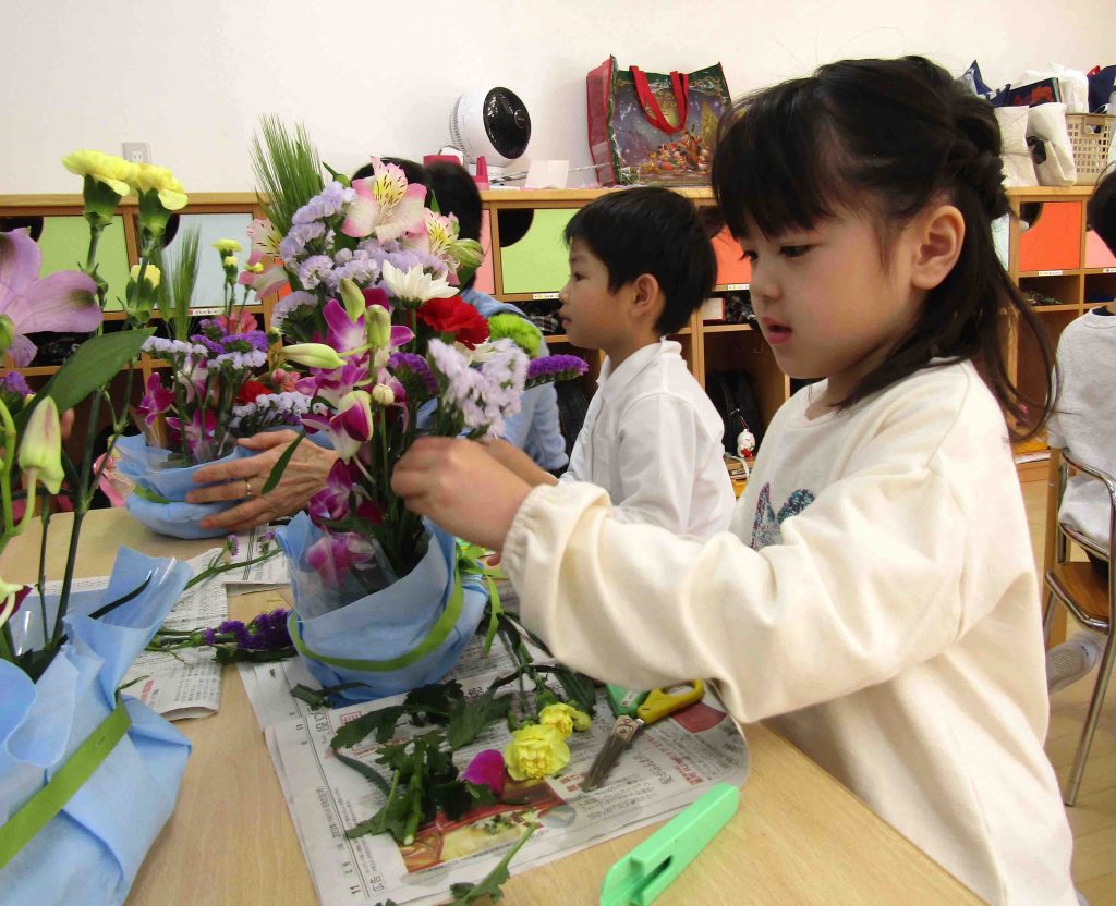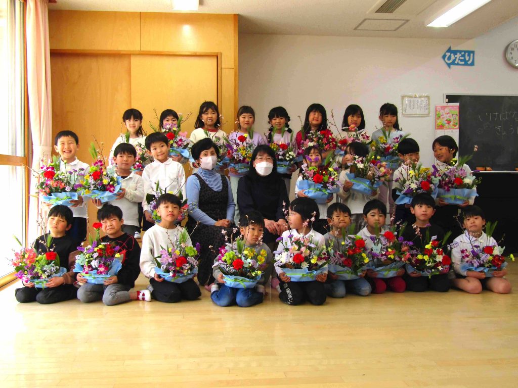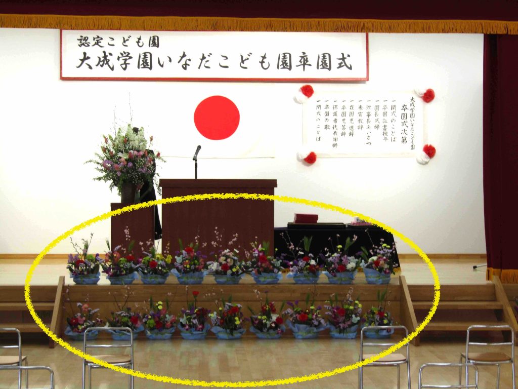 式場を彩った生け花は、前日の生け花教室で年長児が生けたものです。備海先生と長久保先生に1つ1つ丁寧に教えていただきました。卒園式会場が、自分たちのお花でとっても華やかになりました👏