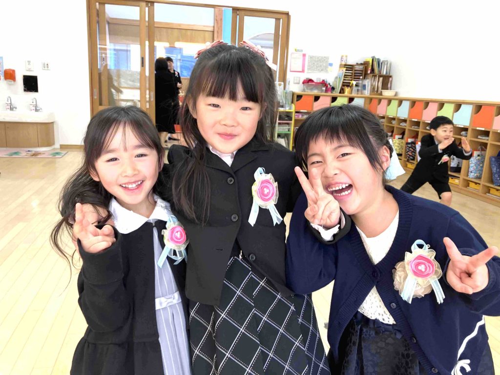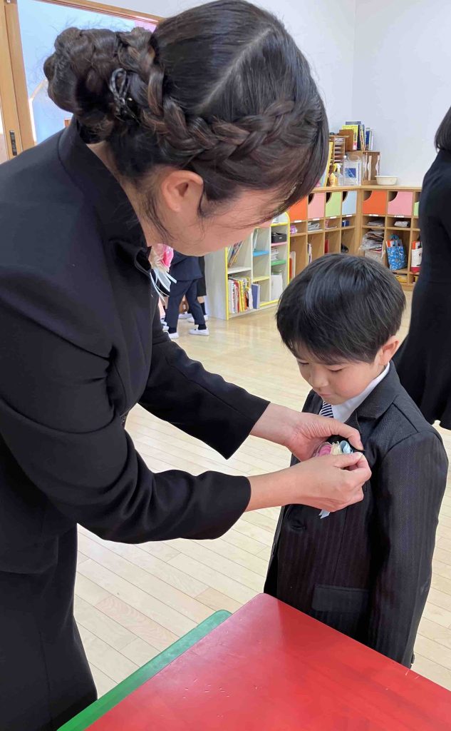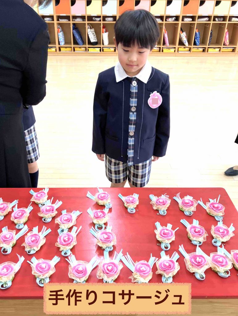 式の前に、担任の先生からコサージュをつけてもらいます。『こんなに大きくなるなったのね』と、子どもたちの成長を感じる瞬間です☺️このコサージュ、先生たちの手作りなのです✨愛情がたっぷり詰まったコサージュを胸につけ、さぁ入場します!!
