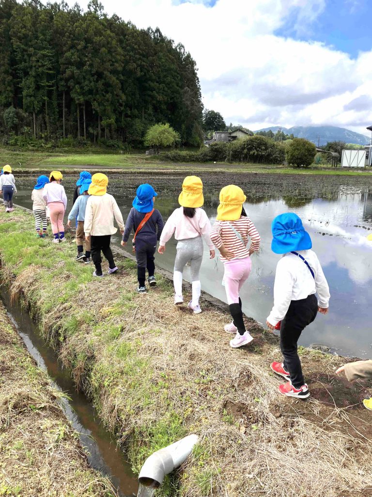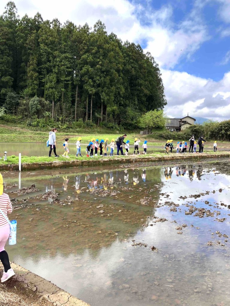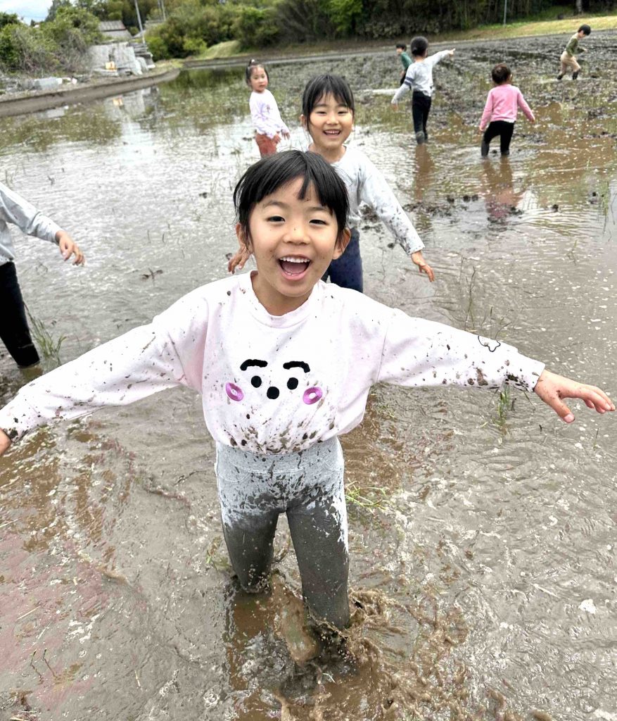いなだこども園の周りは、豊かな自然環境に恵まれています。子どもたちの身近にある田んぼ。なかなか入って遊ぶなんてできませんよね🤭