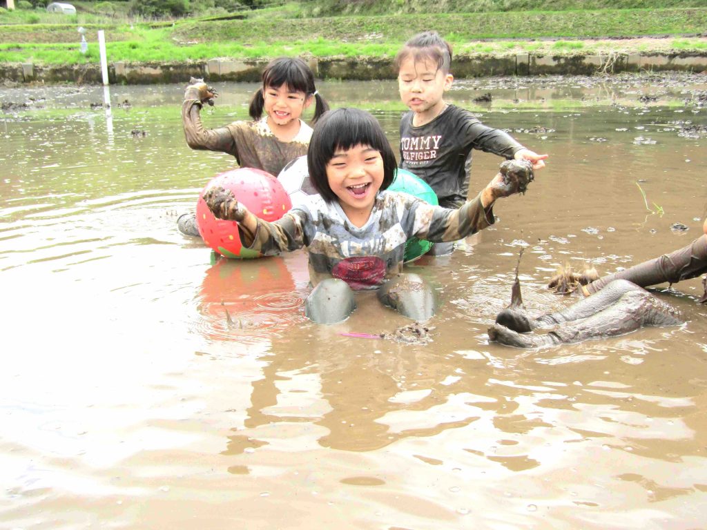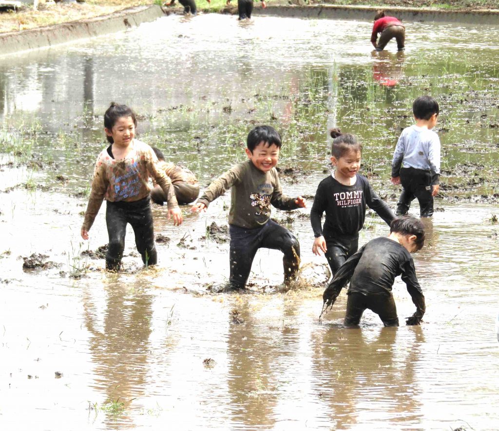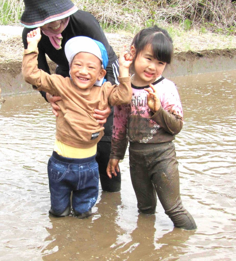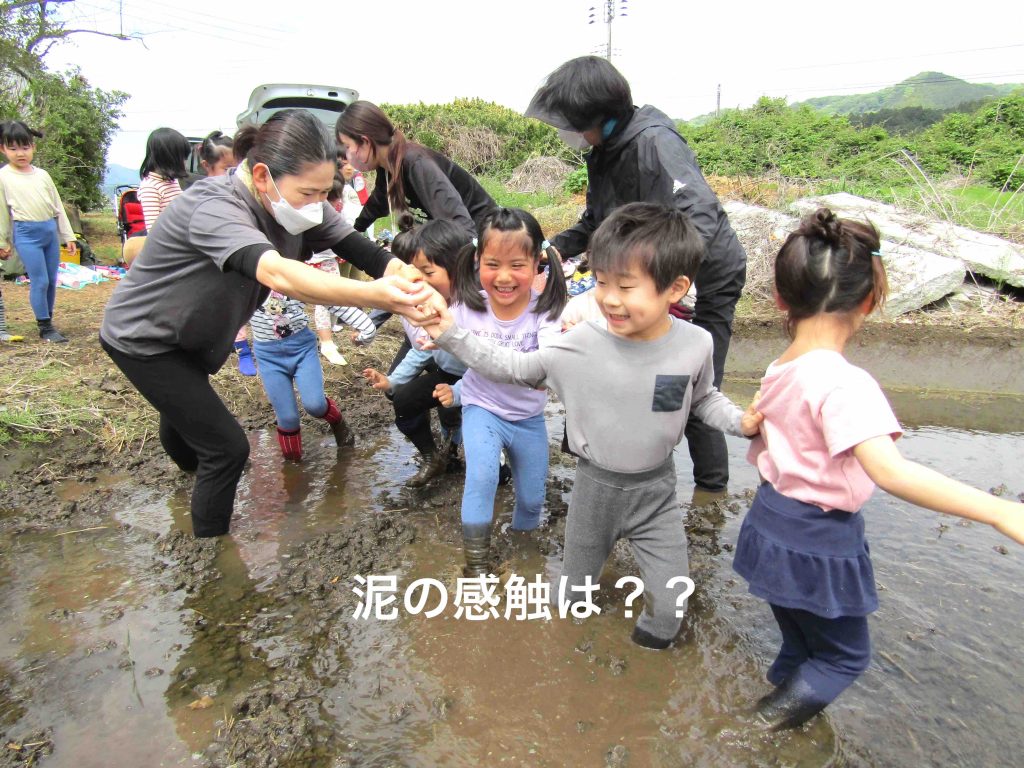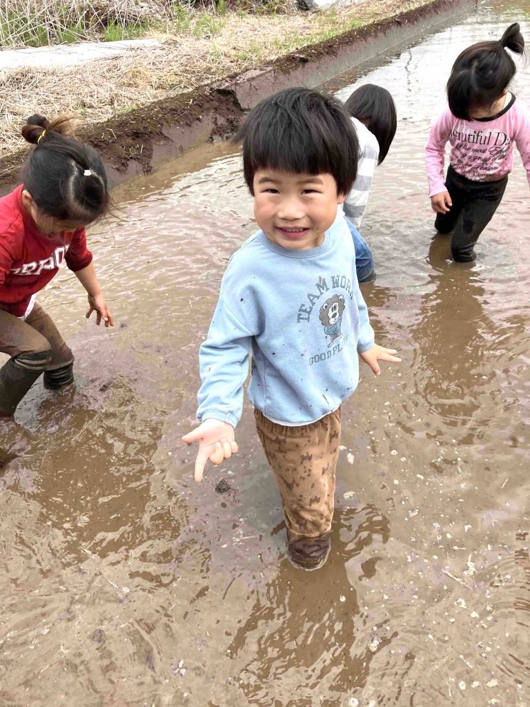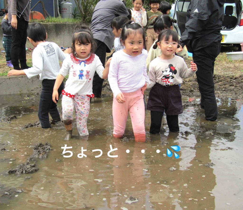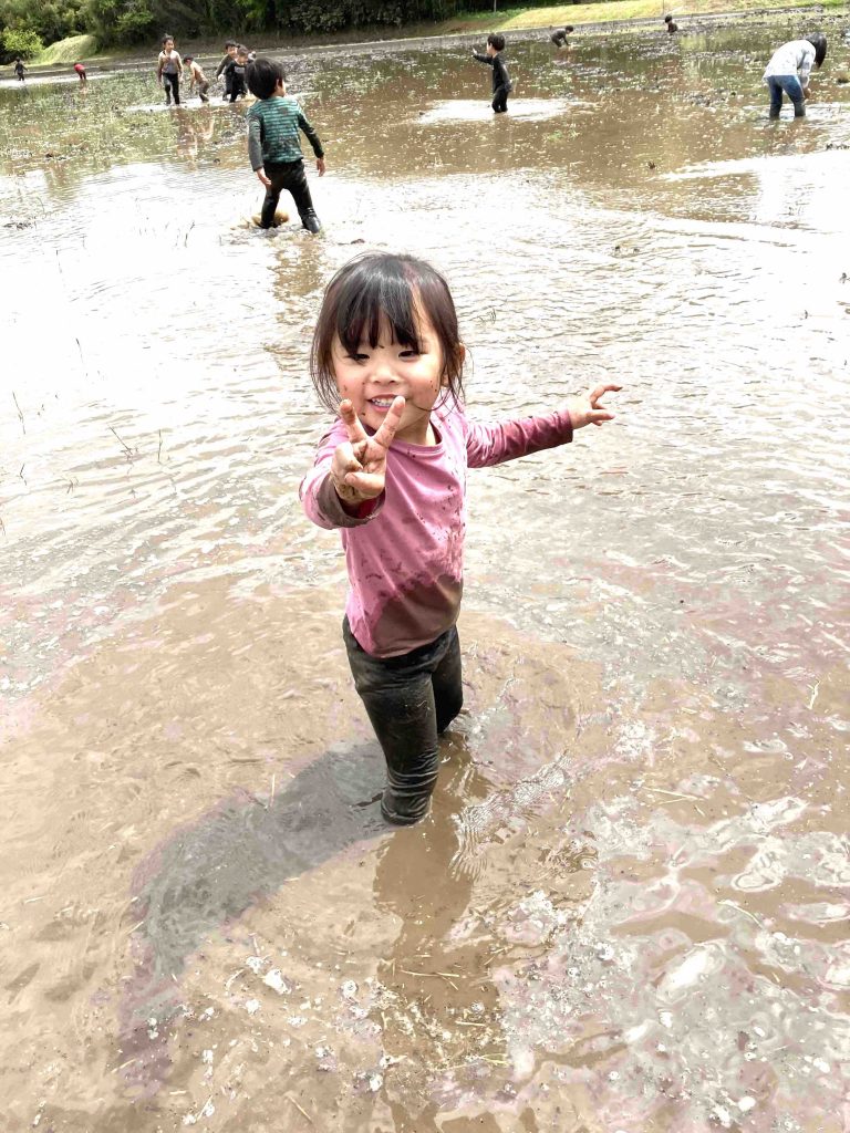 さぁ、田んぼの中にレッツゴー!!初めはそろりそろりと入る子どもたち。表情もそれぞれで、感じる事も違うのでしょうね😄