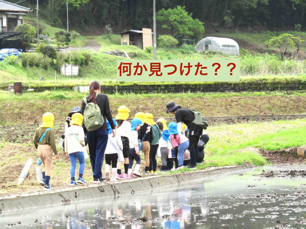 田んぼに着くなり、水面をのぞき込む子どもたち👀水辺の生き物を見つけたようです。白く見える物はカエルのたまご🐸その隣の写真はイトトンボです!青いトンボを見ると縁起がいいとされているようです!!どろんこ遊びが楽しくできる予感♡