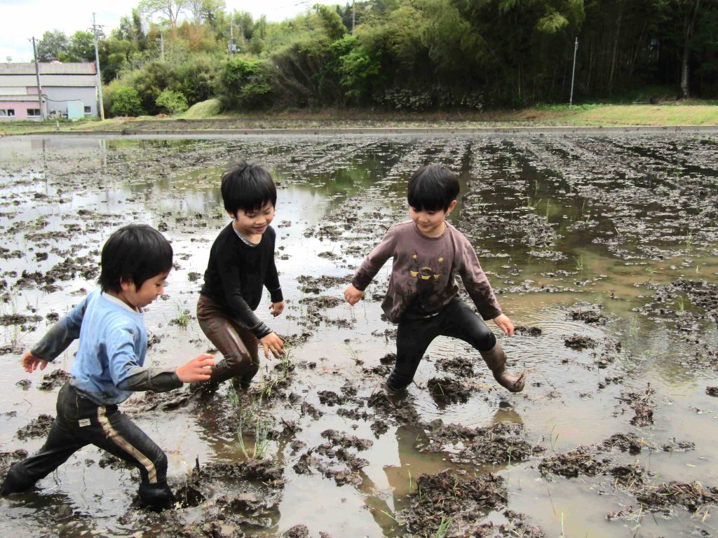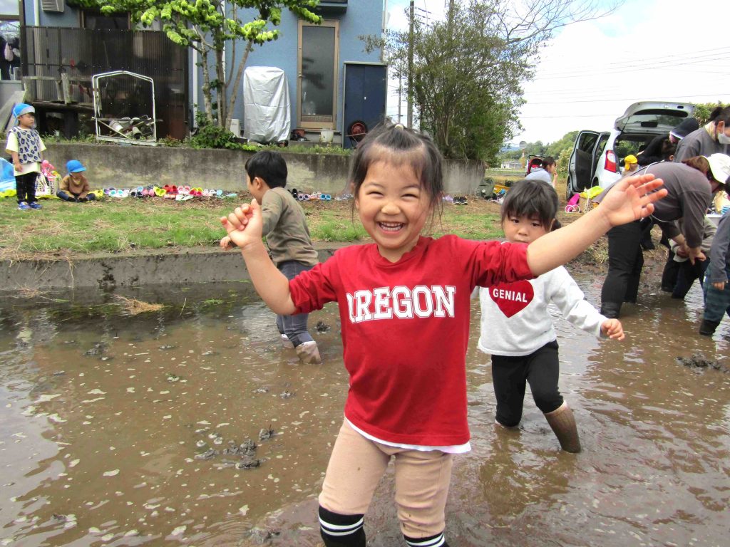 さて、子どもたちが遊んだ田んぼですが、遊ぶ前と遊んだ後の違いが分かりますか??土と水がよく混ぜられています。農家さんが田植え前に行う代掻き(しろかき)の目的は、水田からの水漏れを防いだり、雑草を防いだり土を柔らかくして苗を植えやすくすることだそうです。今度バケツ稲作に挑戦するこどもたち。田んぼとバケツでは規模が違いますが、おいしいお米作りには、なくてはならない作業を体験することがができました!!いなだこども園の“いなだっこ” これからも地域の自然に感謝して大きくなります✨