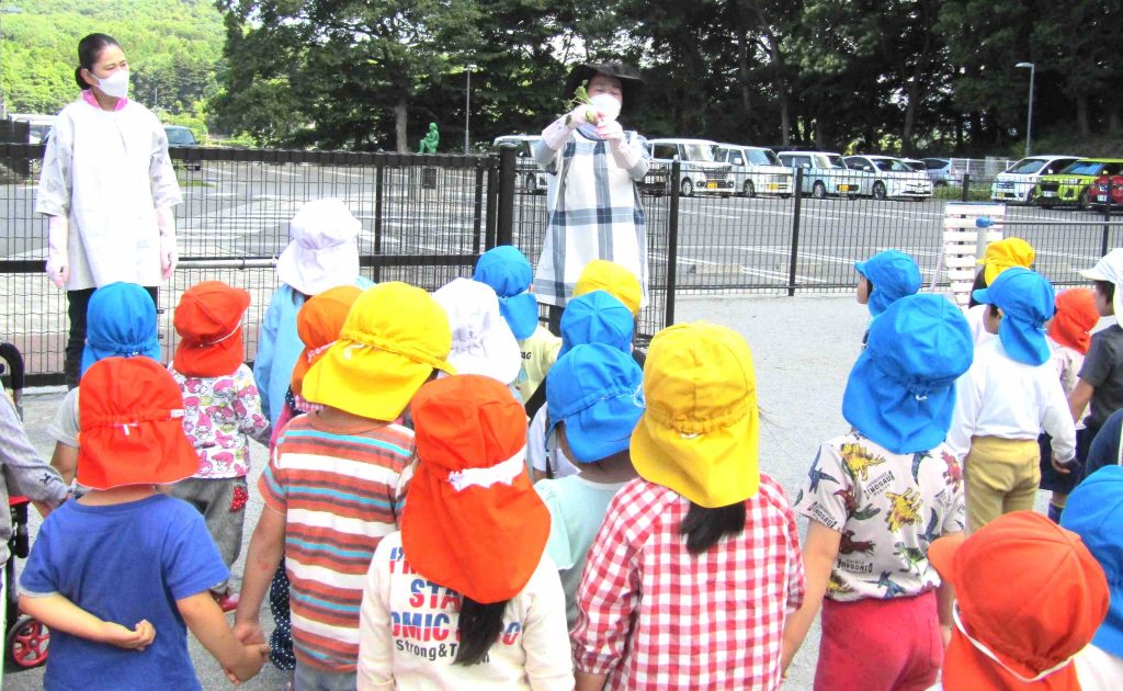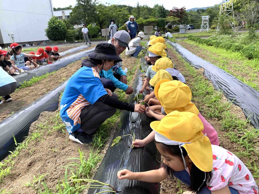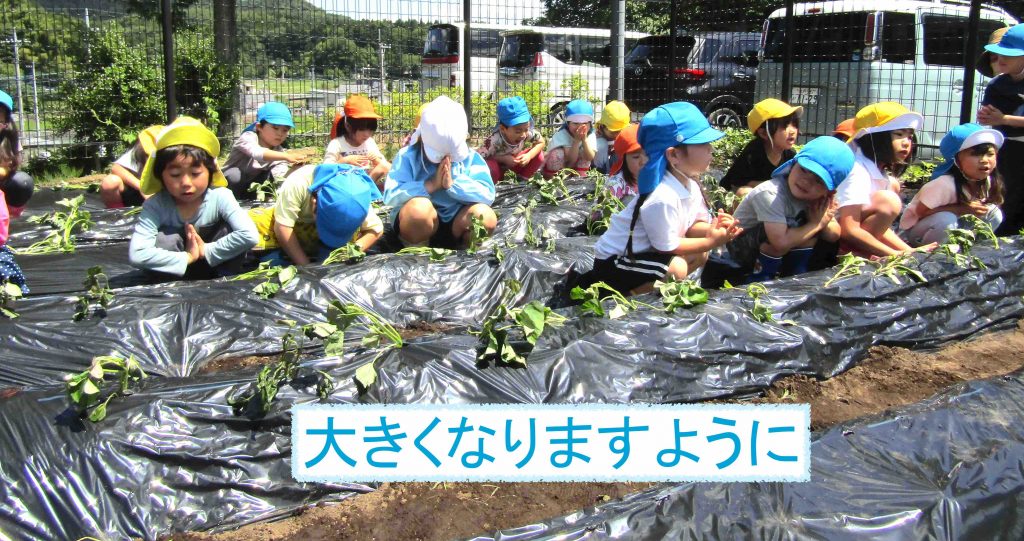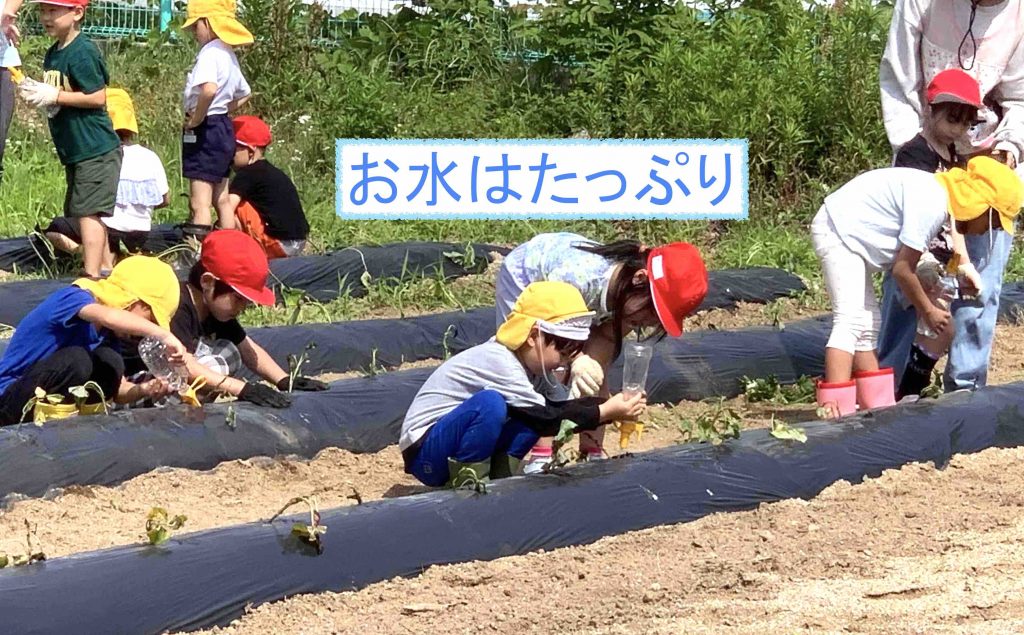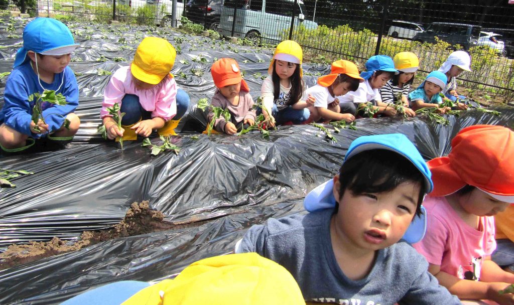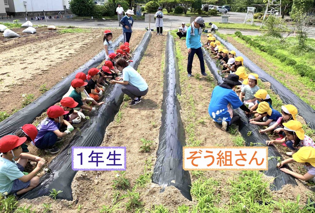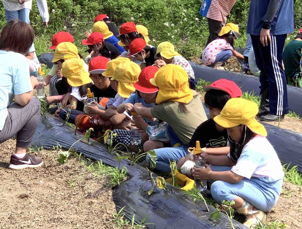 ぱんだ・こあら・きりん・ぞう組の子どもたちは、縦割りグルーで植えます。年長さんがお手本となって小さい子に教えてくれます。子どもたちの小さな社会が見られますね🤭植えた苗はしばらくの間、ぞう・きりん組の子どもたちが水やりをしてくれます。