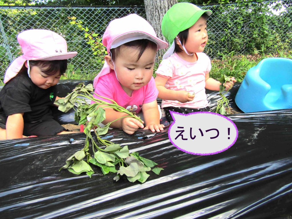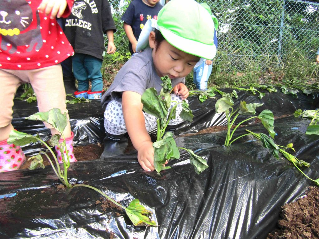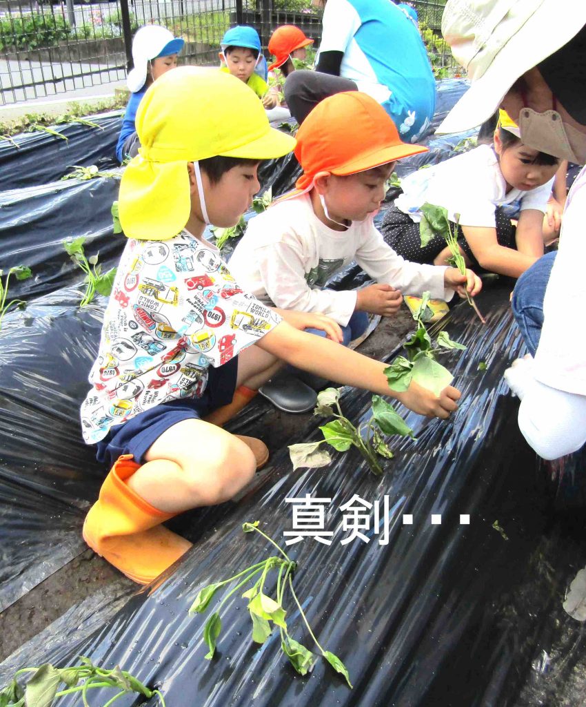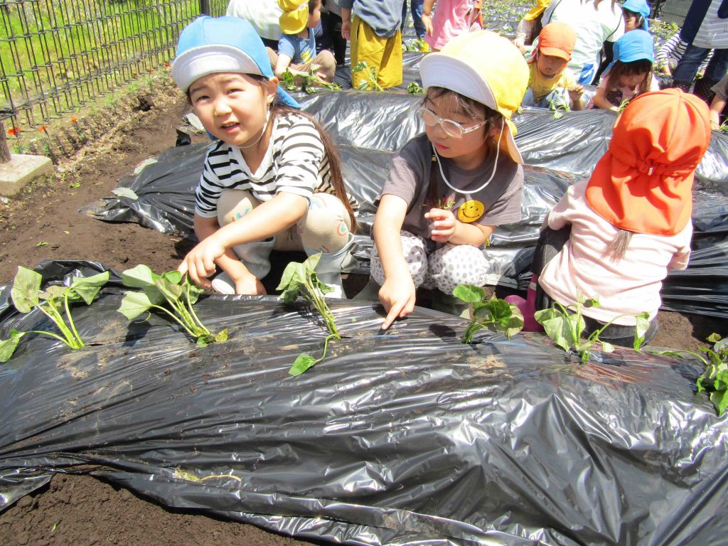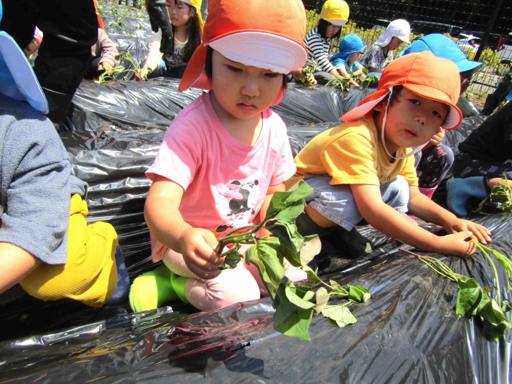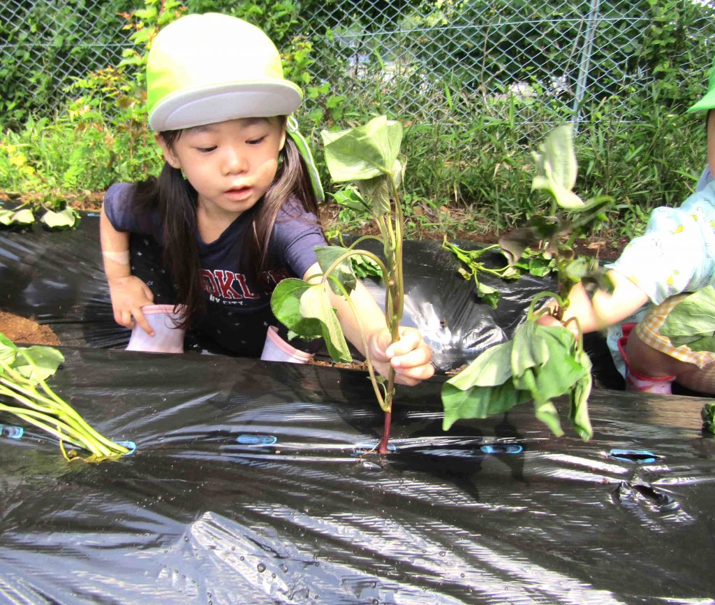 サツマイモの苗は切り苗といって、根っこが付いていません。茎と葉の間の“節”を土に入れることで、そこから根が生えてきます。『斜めに土に植えるといいよ』と園長先生が丁寧に教えてくれました。しっかりお話を聞けた子どもたち、自分でやってみることにしました。