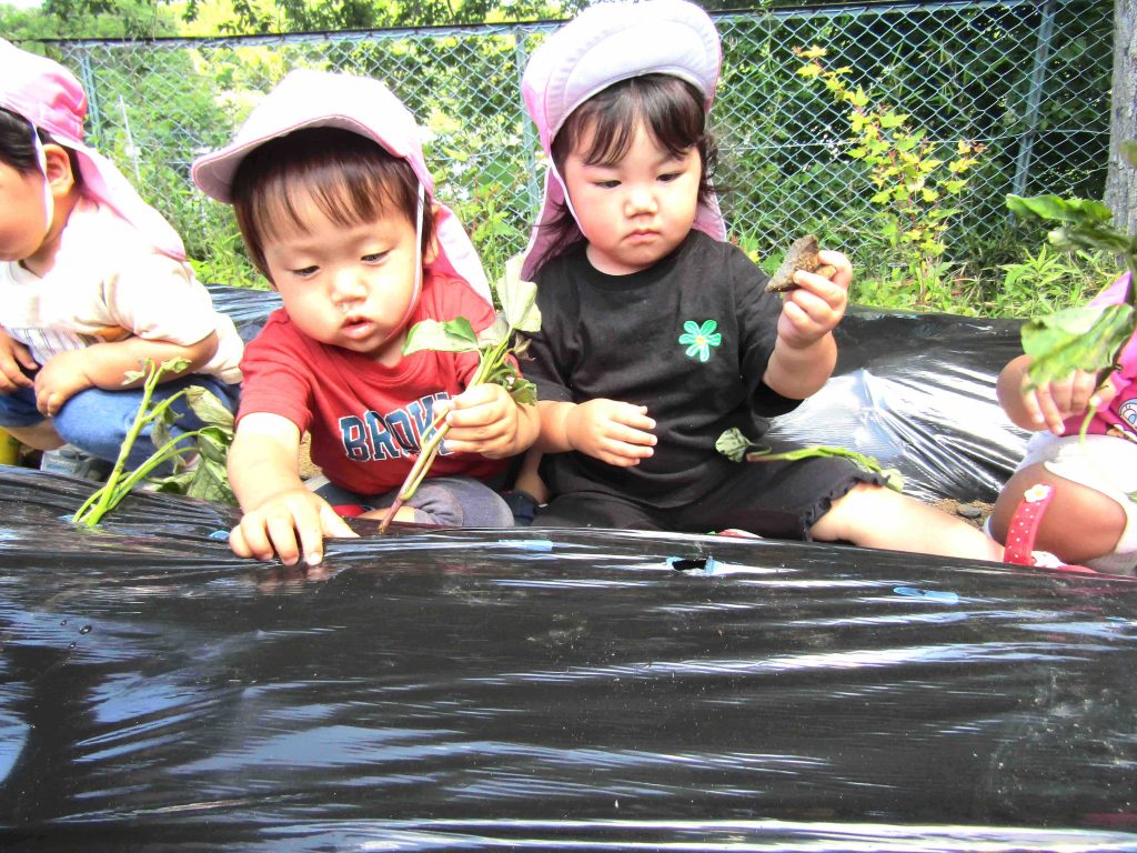 小さなひよこ・りす組さんでも、マルチの穴に苗を上手に入れられました👏穴があったら何かを入れたくなるのは、子どもの性(さが)ですよね。指でものをつまむのには、指先に力を入れようと集中するのでみんな真剣な表情です‼️