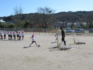 年長さんはサッカーの講師、舩橋先生とコーチの方にきていただきサッカー教室を行いました。