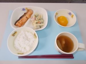 ごはん 鮭の味噌焼き マカロニサラダ 黄桃缶 みそ汁(こまつな・もやし・花麩)。