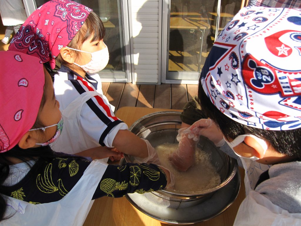 おにぎりを作ってみました。 2020 11/13 ニュース バケツ田んぼで育てたお米!やっと食べる日になりました。5月に植えて9月に収穫。それを精米して”おにぎり”になるまでたくさんの日々でしたが、あま〜くて、おいしい”おにぎり”を食べることができました。 ボールに水をいっぱい入れてお米のザルを沈めてゴシゴシ・・ 研ぎ汁が白くて牛乳みたい!もっととがなくちゃダメだね。 ボールの水がすんできたね。給食室に持っていって炊いてもらいましょう。 自分で握ったおにぎり・・塩をひとつまみ入れてラップに包んで優しくギュッギュッ・・「あま〜い」の声が第一声! ニュース URLをコピーしました! 芋掘り体験 高校生と遊ぶ! コメント コメントする コメントをキャンセルコメント ※ 名前 ※ メール ※ サイト 次回のコメントで使用するためブラウザーに自分の名前、メールアドレス、サイトを保存する。 上に表示された文字を入力してください。 Δ