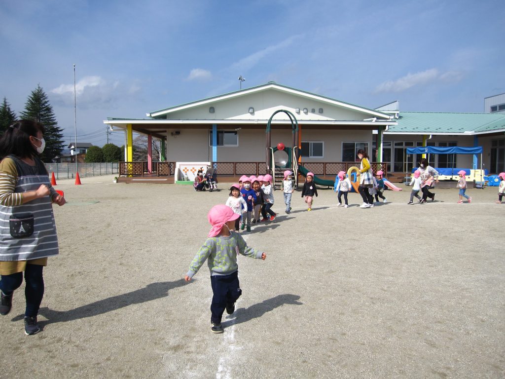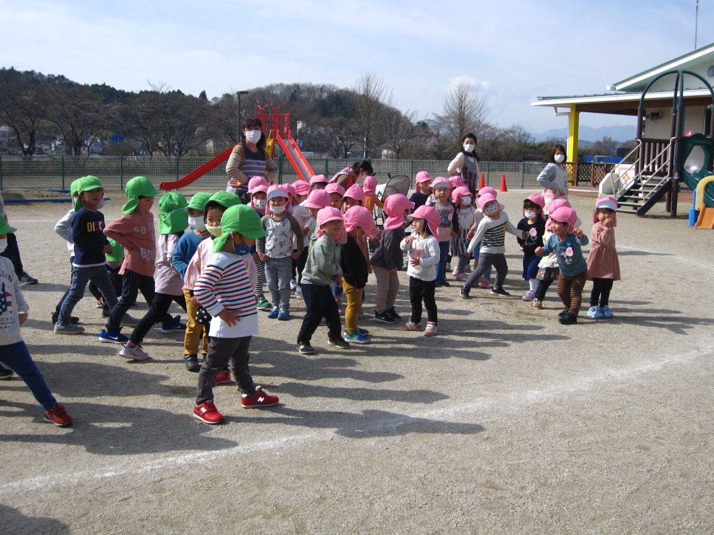 もうすぐ年少さんに進級する”うさぎ組・りす組”さんが大きなお友達の隣に整列です。『自分で靴が履けて、並ぶ事ができる人〜!』と聞かれたうさぎ組とりす組のお友達は、元気に『はぁ〜い!」と手が高く上がり、今日から仲間入りしました。