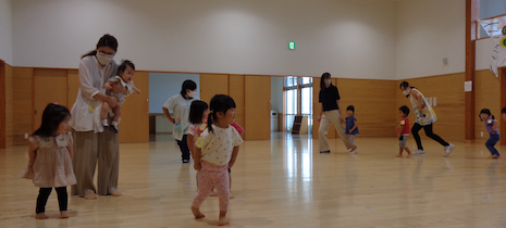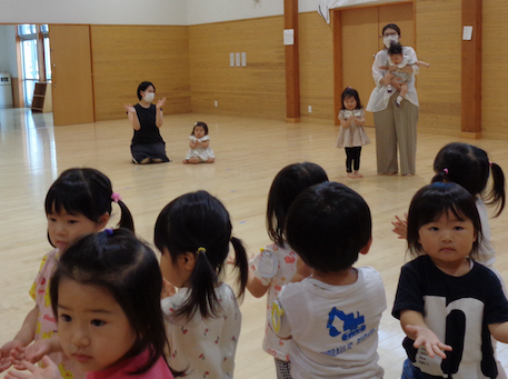 2歳児クラスと子育て支援センター『みつばち』との交流です。ホールに集合して一緒に体操をしたりリトミックをしたり一緒に遊びました。初めは少し離れてお互いに緊張気味でしたが、次第に元気な声が聴かれるようになりました。