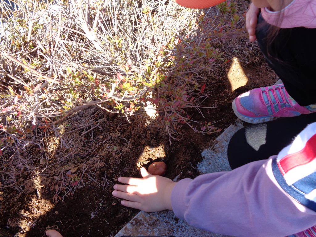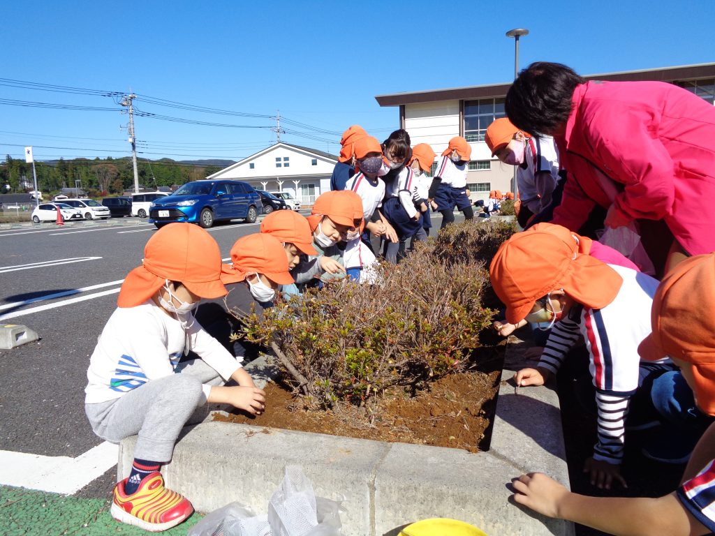 ♪チューリップのうた♪と同じように赤白黄色と咲くように願いを込めて植えました。寒い冬に耐えられるように土もたくさんかけました。春にチューリップが咲く頃は、一年生になっていて見られないけど、咲いたらきっとみんなが喜ぶね!とチューリップのうたを歌いなが植えました。