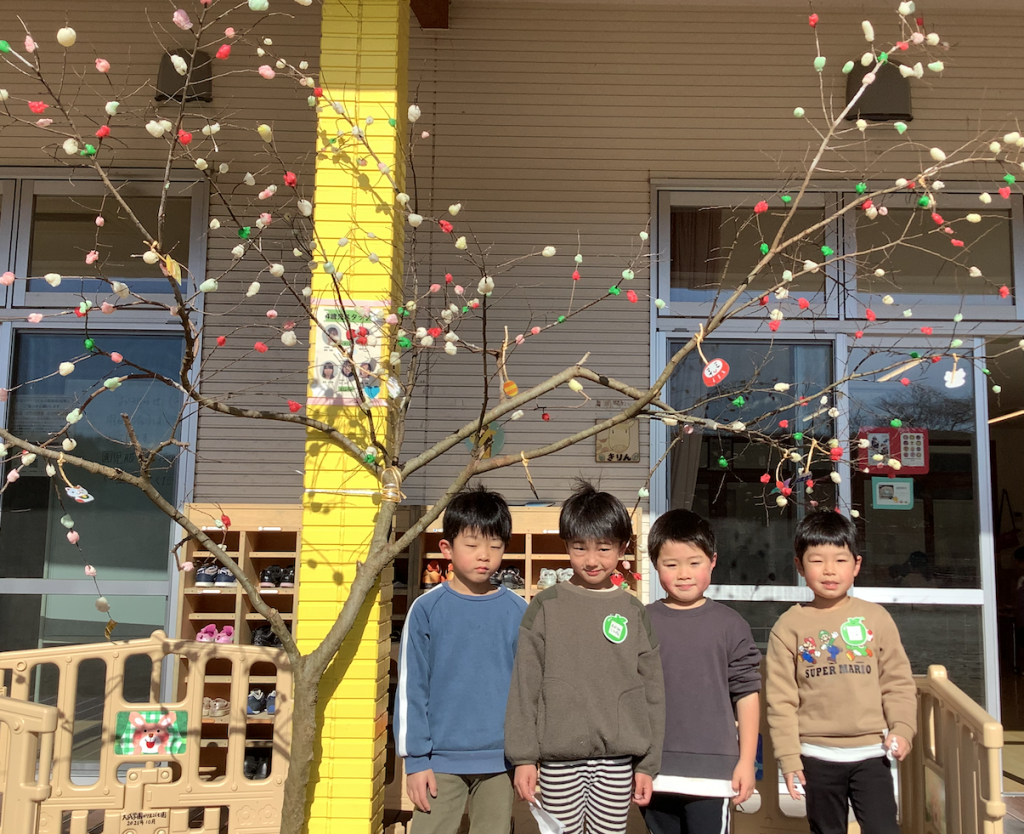 みんなでついたお餅が繭玉に! 2022 1/12 ニュース 餅に色をつけて枯れ木に餅をつけました。餅を丸めて花のように奇麗に飾ることができました。枯れ枝に飾れなかった繭玉は、のれんのようにひもにつけてお部屋の前に飾りました。 石臼の下のわらは、年長さんが育てたいねわらを使いました。のび〜るお餅がつけました。 繭玉がざりは、きりんくみさんの前に設置しました。 ニュース URLをコピーしました! 鏡開きを終えての餅つき はじめての切り干し大根作り コメント コメントする コメントをキャンセルコメント ※ 名前 ※ メール ※ サイト 次回のコメントで使用するためブラウザーに自分の名前、メールアドレス、サイトを保存する。 上に表示された文字を入力してください。 Δ