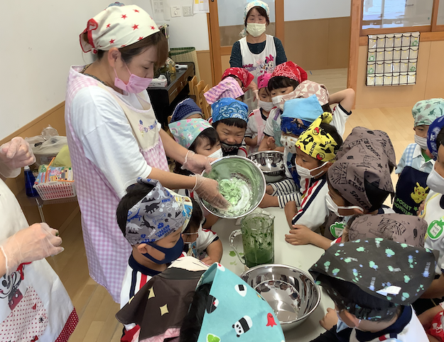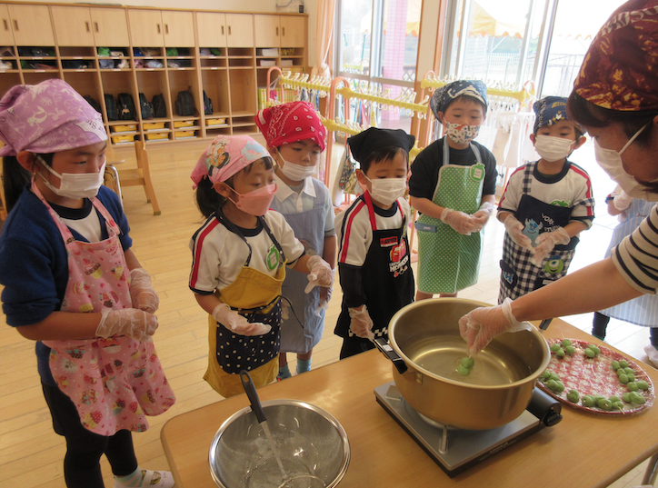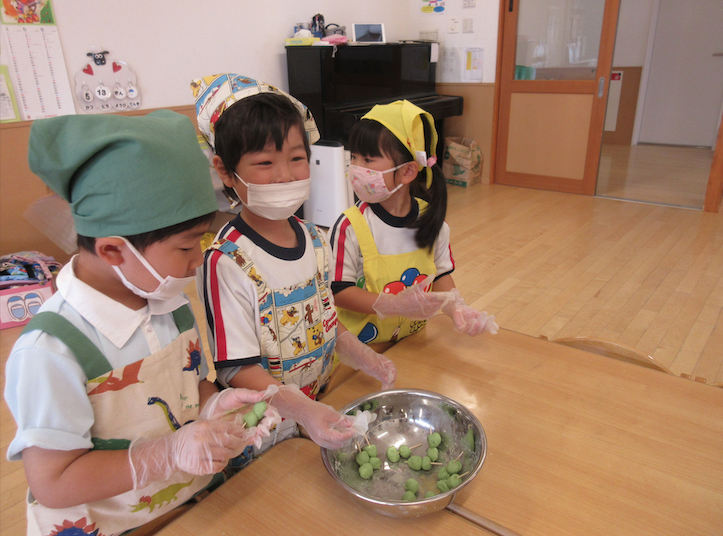ずっと楽しみにしていたよもぎ団子作り。エプロンを身に付けると子どもたちの顔も満面の笑顔に!!