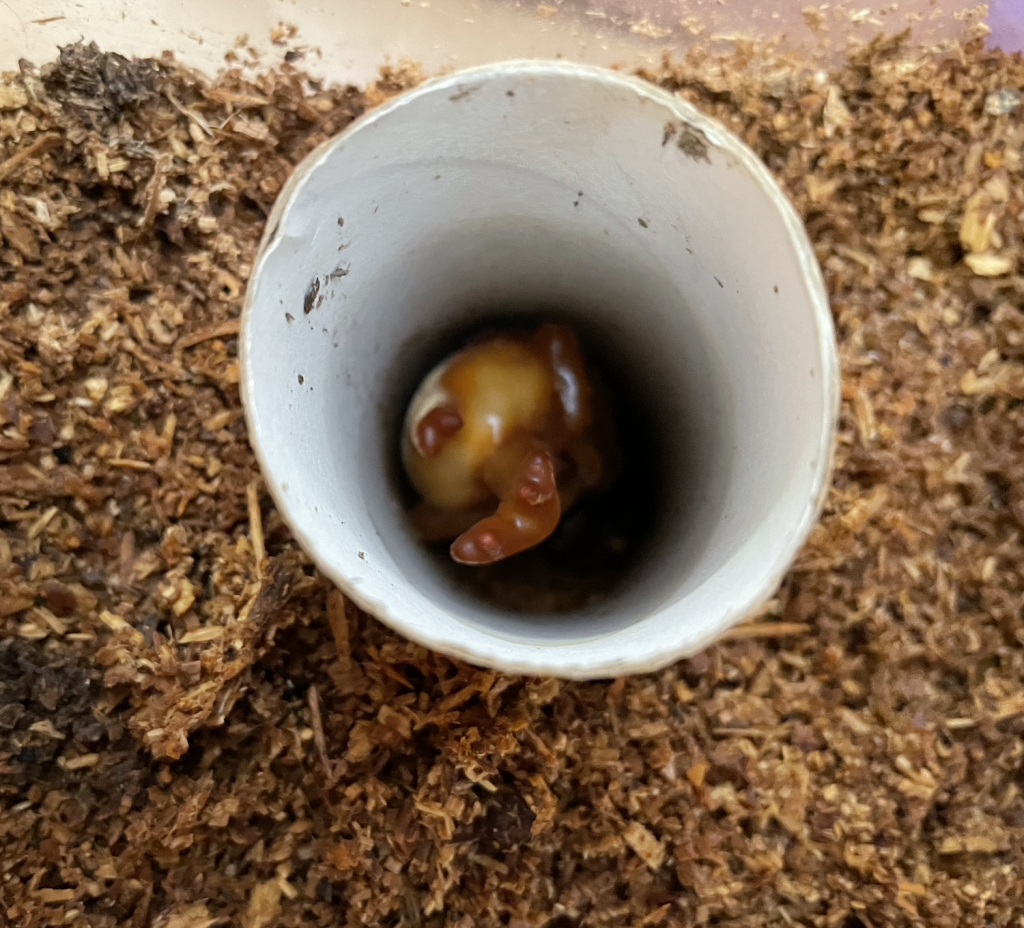 幼虫が育つようトイレットペーパーの芯でおうちを作ってあげると、次はさなぎになりました。