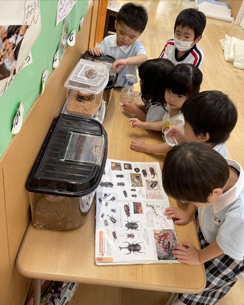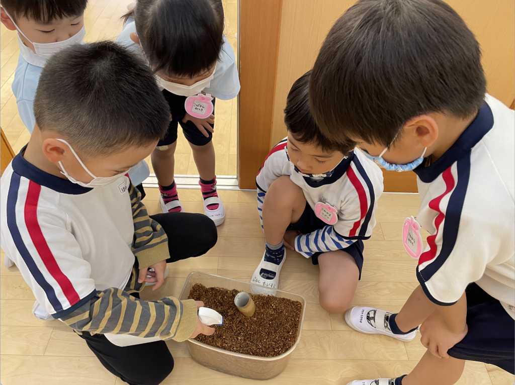 土の中にいる幼虫が乾かないように、毎日霧吹きでお水をかけ土の管理もしました。「ぼくもやりたい!」「じゅんばんね!」と友達との関わり方も学んでいきました。