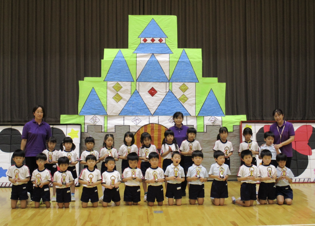 年少児はプーさん&ピグレットに変身!遊戯とバルーンに挑戦です。初めての運動会でしたが笑顔で参加しました。