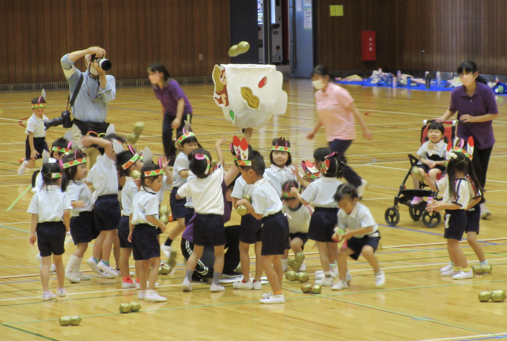 年中児はチップとデールに変身!玉入れと遊戯を行いました。自分たちで作ったピーナッツとどんぐりを持って玉入れがスタートです。今日は1勝1敗の引き分け!
