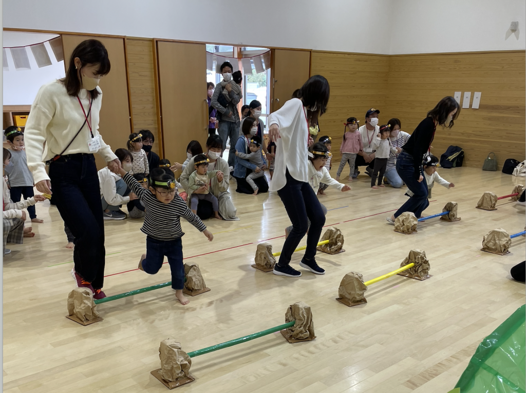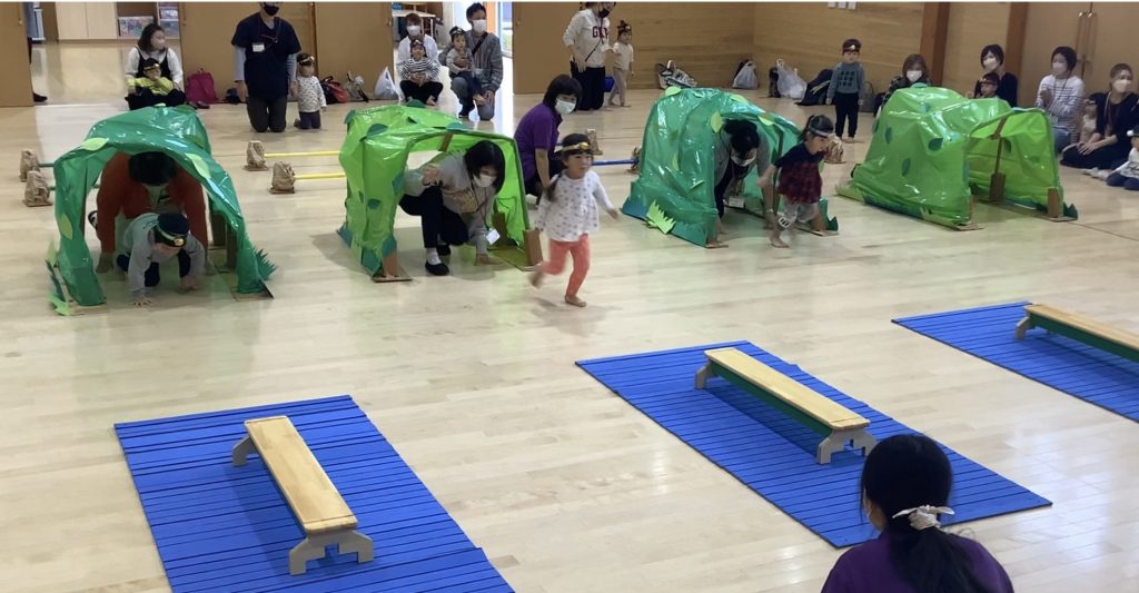 お母さん、お父さんと手をつないで岩のハードルを跳んだり、ジャングルトンネルをくぐったり、橋の上をバランスをとって渡ったりしました。わくわくどきどきジャングル探検楽しかったね!