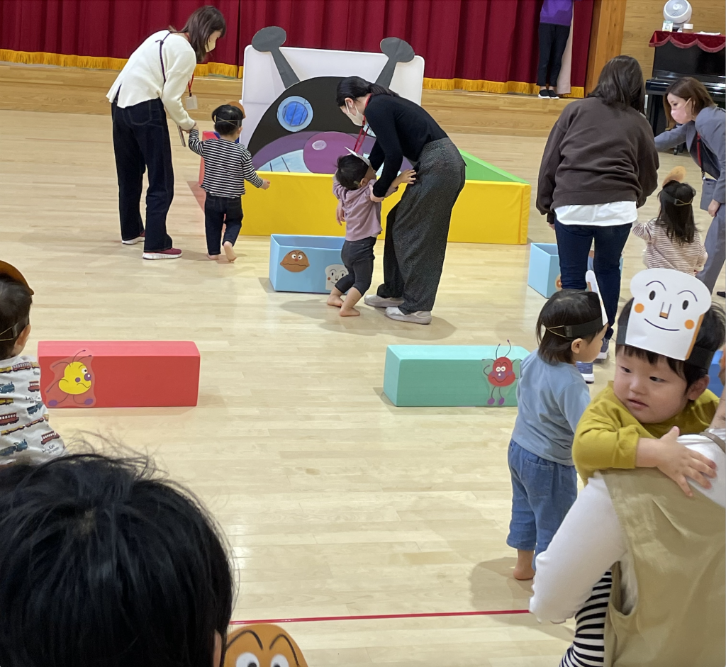 1歳児の子どもたちは、みんなが大好きなアンパンマン、しょくぱんまん、カレーパンマン、メロンパンナのお面をかぶりスタートです!
