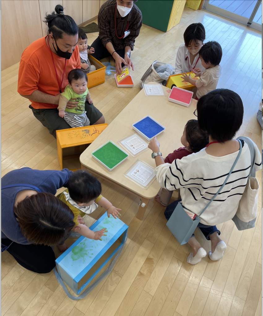 0歳児は、親子で車作りをしました。これは何だろう?色々な色のスタンプで手型をペタペタ!ペンでお絵描きもしました。