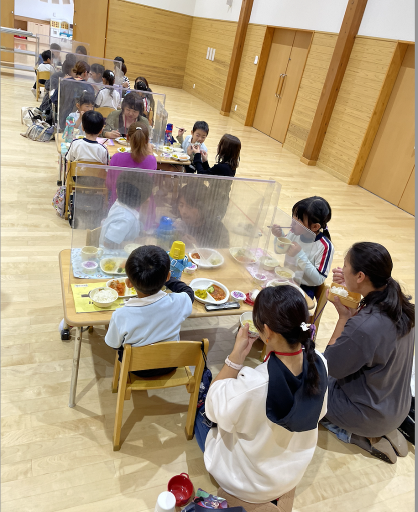 親子で給食を一緒に食べました。この日のメニューは年長さんが育てたカボチャを使ったサラダでした。「僕たちが作ったカボチャだよ!食べてみて」と得意げに話す子どもたち。いつも以上においしくいただきました!