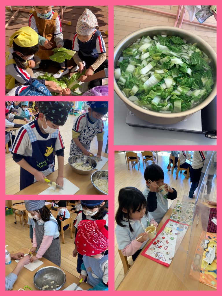 無農薬の白菜はたくさん虫に食べられていたけれど、中は真っ白で奇麗な白菜になっていました。大きな大根と共に食べやすい大きさに切ってお鍋へ!!具だくさんのみそ汁になりみんなでおいしく食べました。