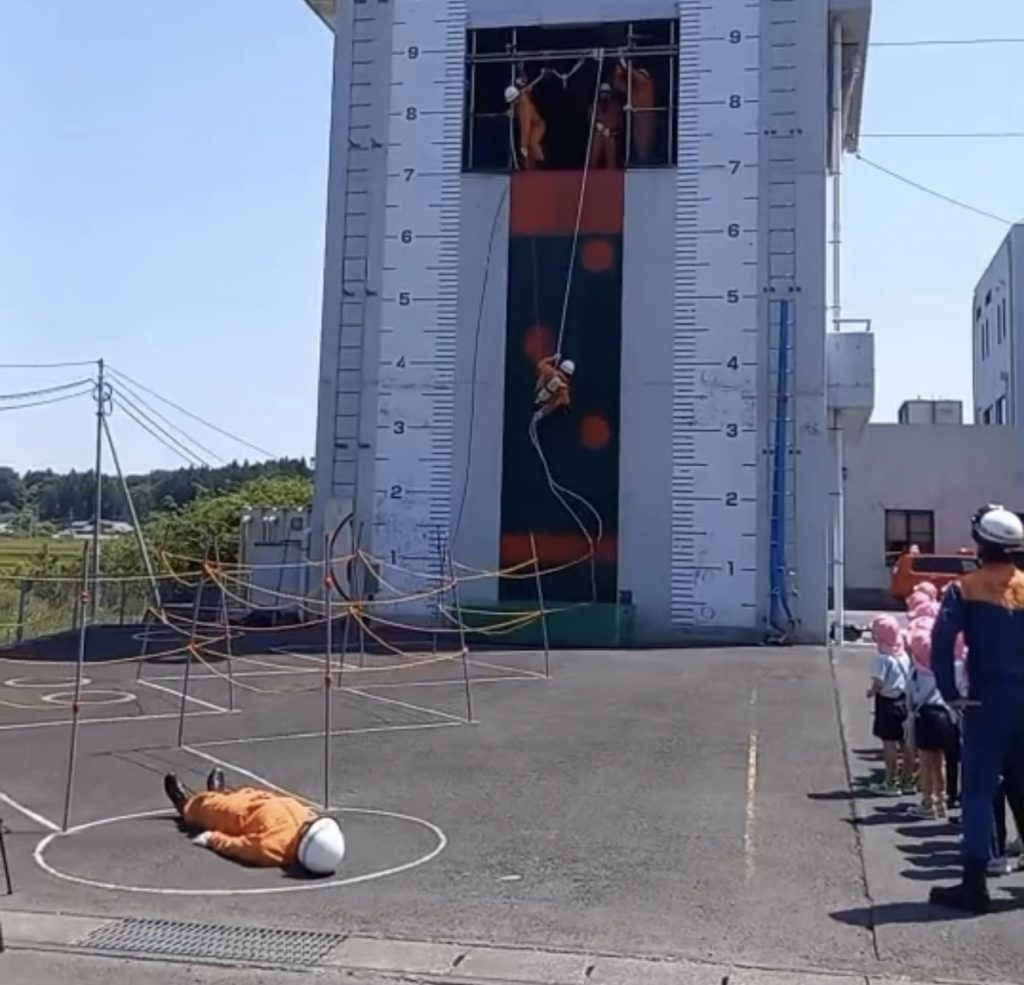 レスキュー隊の練習を見学しました。子どもたちが応援していたので、「良いタイムを出すぞ!」と救助訓練を披露してくれました。スピードと迫力に、みんな目を丸くしていました。
