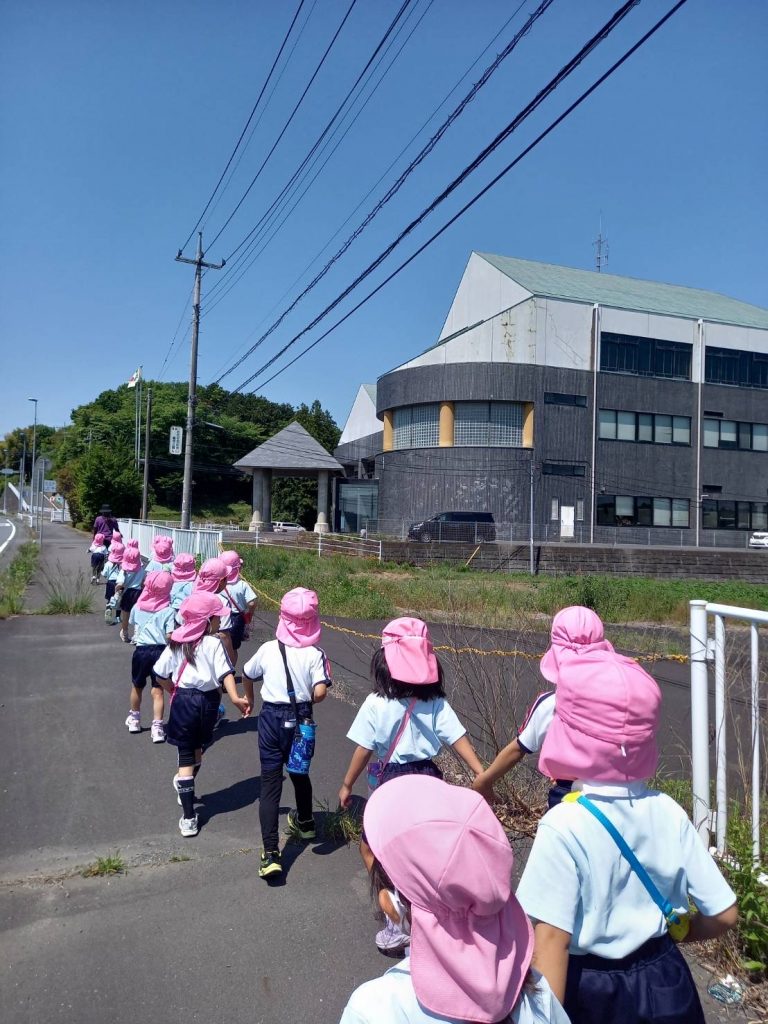 今日はお散歩日和。水筒を下げてぞう組さん、らいおん組さん仲良く手をつないで消防署目指してレッツゴー!!