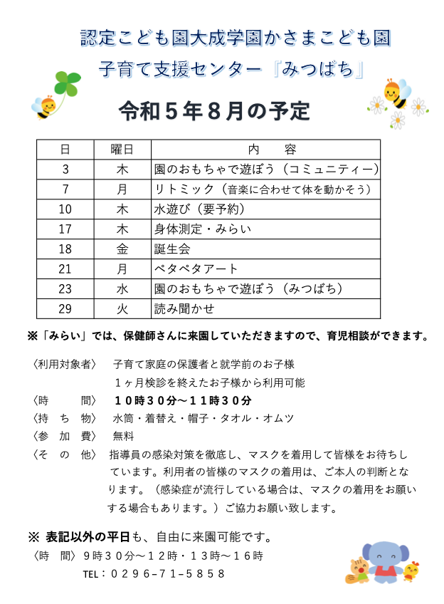 【みつばち】みつばち8月の予定 🐝 2023 8/02 子育て支援センターみつばち 子育て支援センターみつばち URLをコピーしました! 「幼児からはじめる たのしくあそべるプログラミング」が出版されました🎉 【みつばち】水あそび 8月10日(木)🐝 コメント コメントする コメントをキャンセルコメント ※ 名前 ※ メール ※ サイト 次回のコメントで使用するためブラウザーに自分の名前、メールアドレス、サイトを保存する。 上に表示された文字を入力してください。 Δ