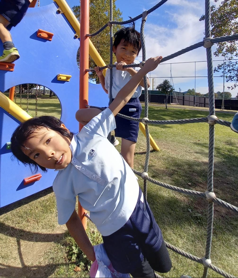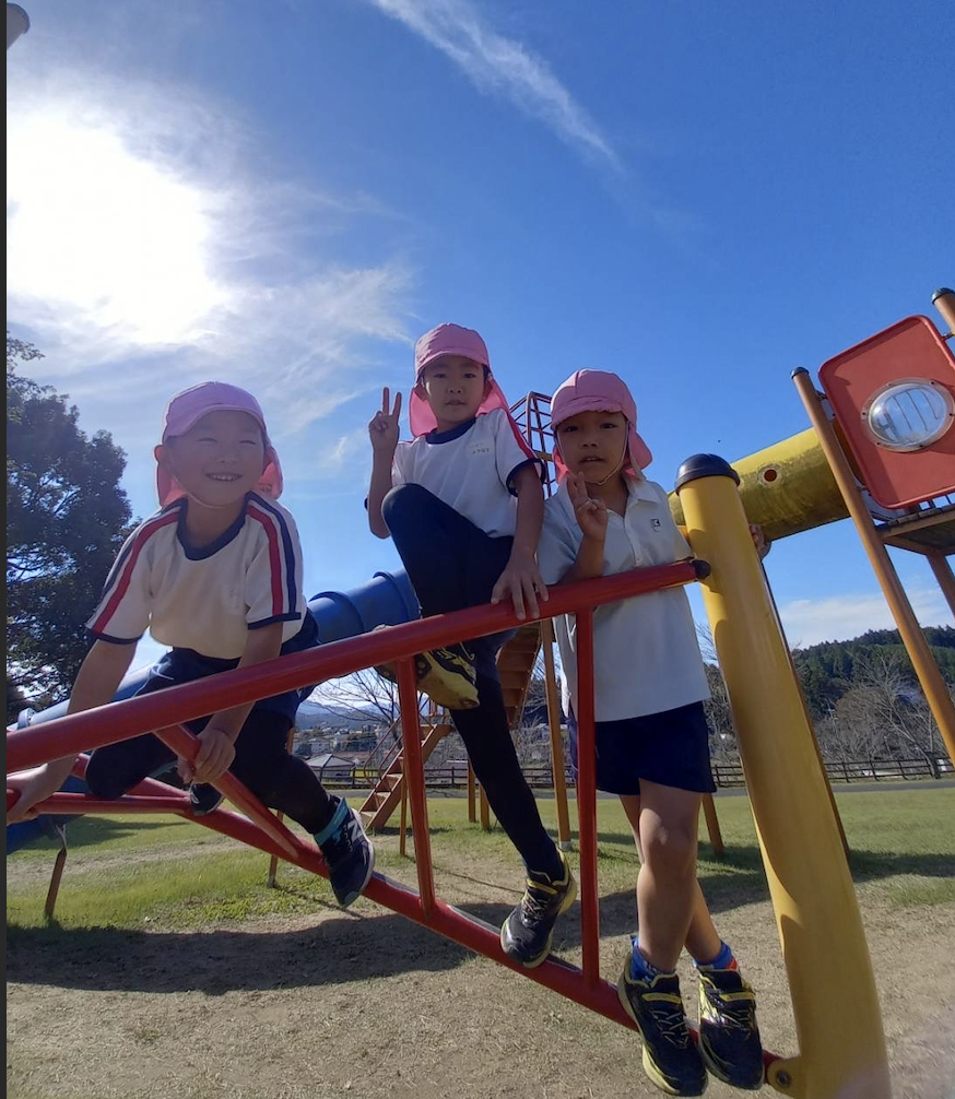公園では伸び伸びと体を動かし元気いっぱい。青空の下自分で握ったおにぎりを頬張ると「おいし〜ぃ」と満面の笑みで食べていました!