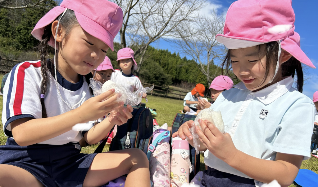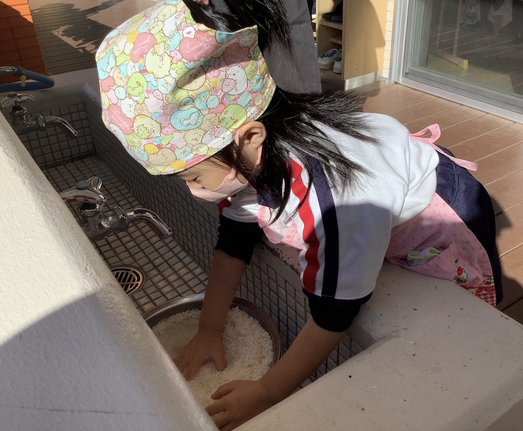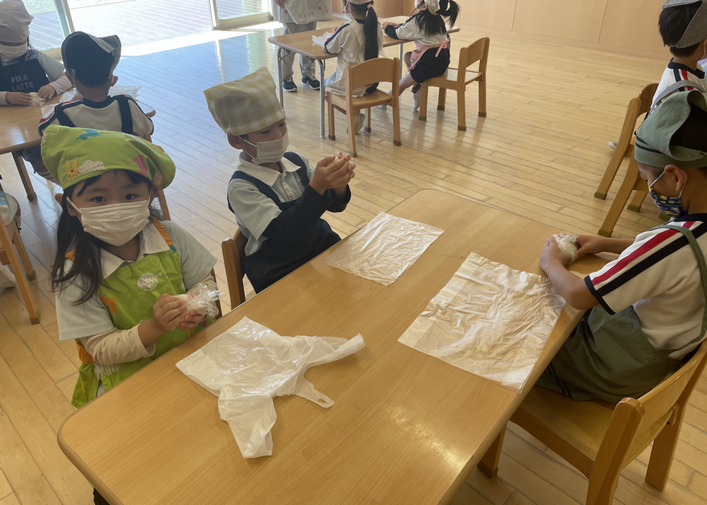 頑張って育てたお米をいよいよおにぎりにして笠間市総合運動公園へお散歩に出かけました。朝から早速エプロンを身につけお米研ぎ開始。「おいしくなーれ!」とみんなで掛け声をかけながら丁寧に研ぎました。炊き上がるとご飯のいい匂いを感じながら、おにぎりギュッギュ!!子どもたちのかわいらしい手の形のおにぎりが出来上がりました。