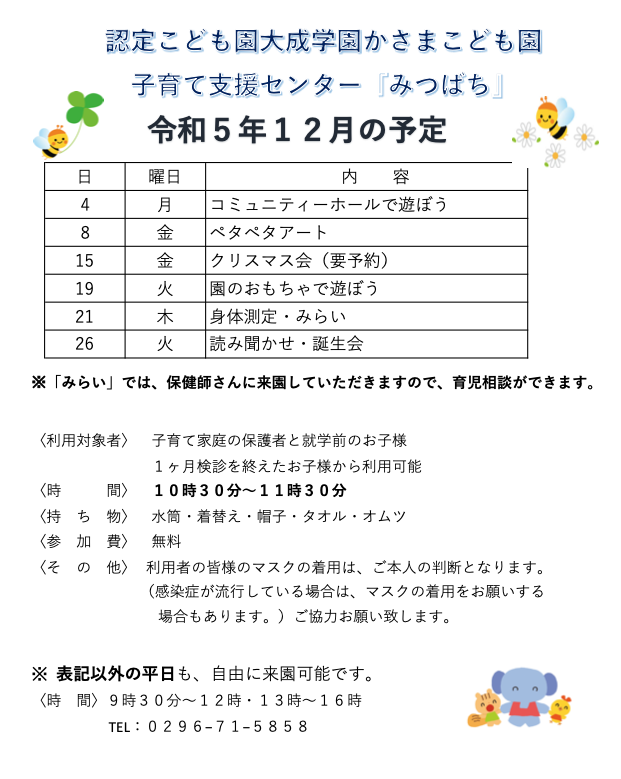 支援センターみつばち 2023 11/28 子育て支援センターみつばち 子育て支援センターみつばち URLをコピーしました! 親子体操教室 支援センターみつばち コメント コメントする コメントをキャンセルコメント ※ 名前 ※ メール ※ サイト 次回のコメントで使用するためブラウザーに自分の名前、メールアドレス、サイトを保存する。 上に表示された文字を入力してください。 Δ