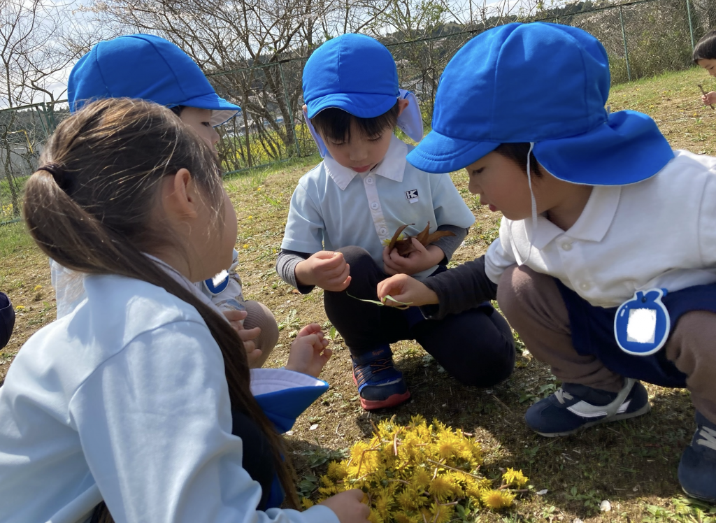 グラウンドで春の自然探しをしました。