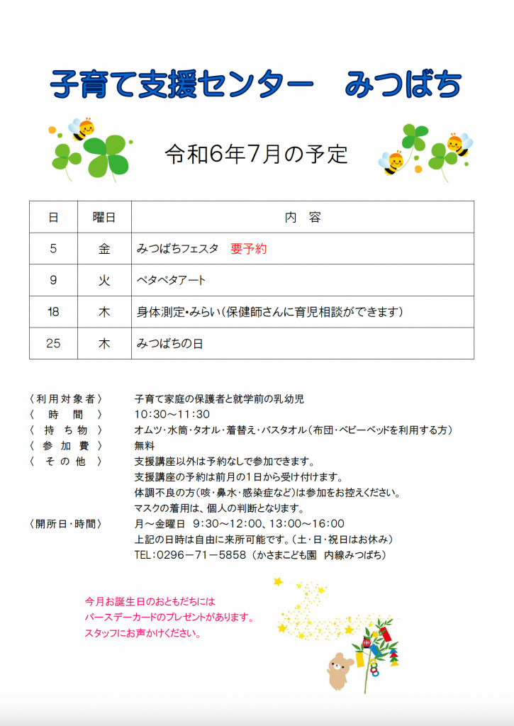 子育て支援センターみつばち令和6年度7月の予定 2024 6/25 子育て支援センターみつばち 子育て支援センターみつばち URLをコピーしました! 令和6年度支援講座変更のお知らせと7月の支援講座について 七夕の会🎋✨ コメント コメントする コメントをキャンセルコメント ※ 名前 ※ メール ※ サイト 次回のコメントで使用するためブラウザーに自分の名前、メールアドレス、サイトを保存する。 上に表示された文字を入力してください。 Δ