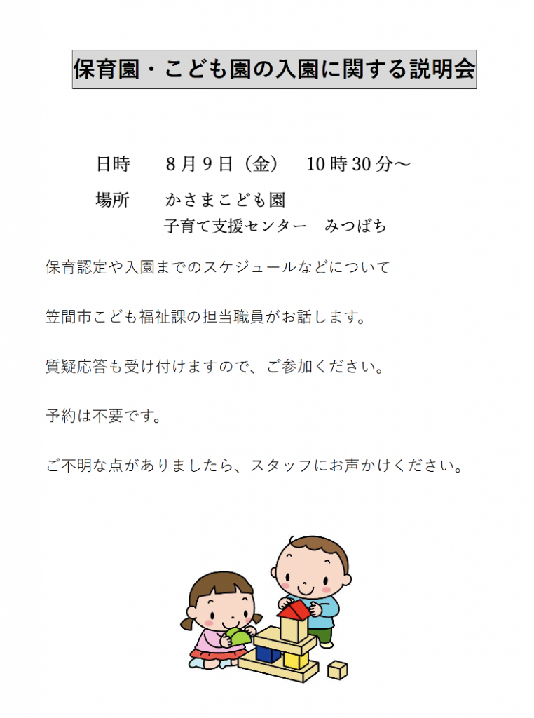 子育て支援センターみつばち 保育園・こども園の入園に関する説明会のお知らせ 2024 8/02 子育て支援センターみつばち 子育て支援センターみつばち URLをコピーしました! ✨ボディーペインティング✨ 子育て支援センターみつばち お盆休みのお知らせ コメント コメントする コメントをキャンセルコメント ※ 名前 ※ メール ※ サイト 次回のコメントで使用するためブラウザーに自分の名前、メールアドレス、サイトを保存する。 上に表示された文字を入力してください。 Δ
