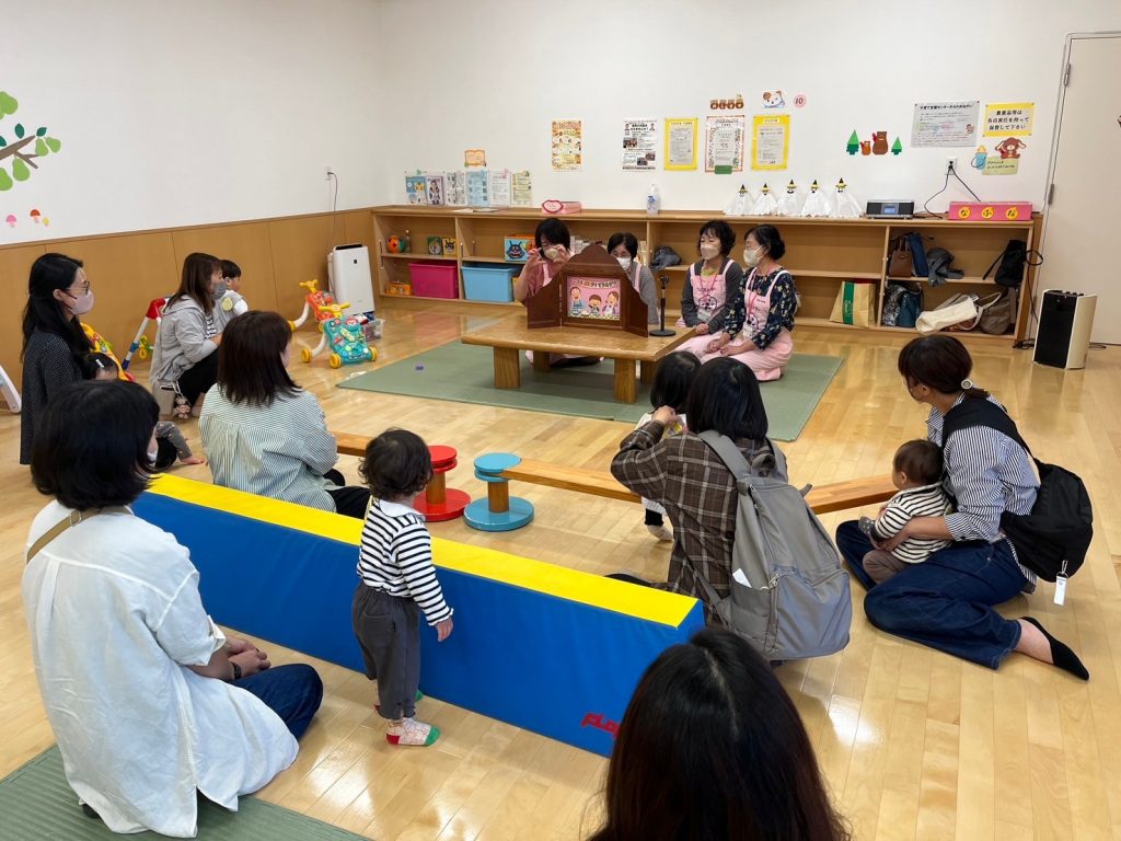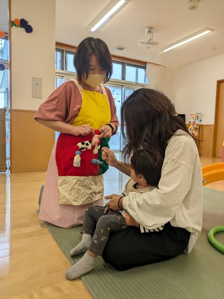 紙芝居「ころりおにぎりできあがり」をじっと見ています。