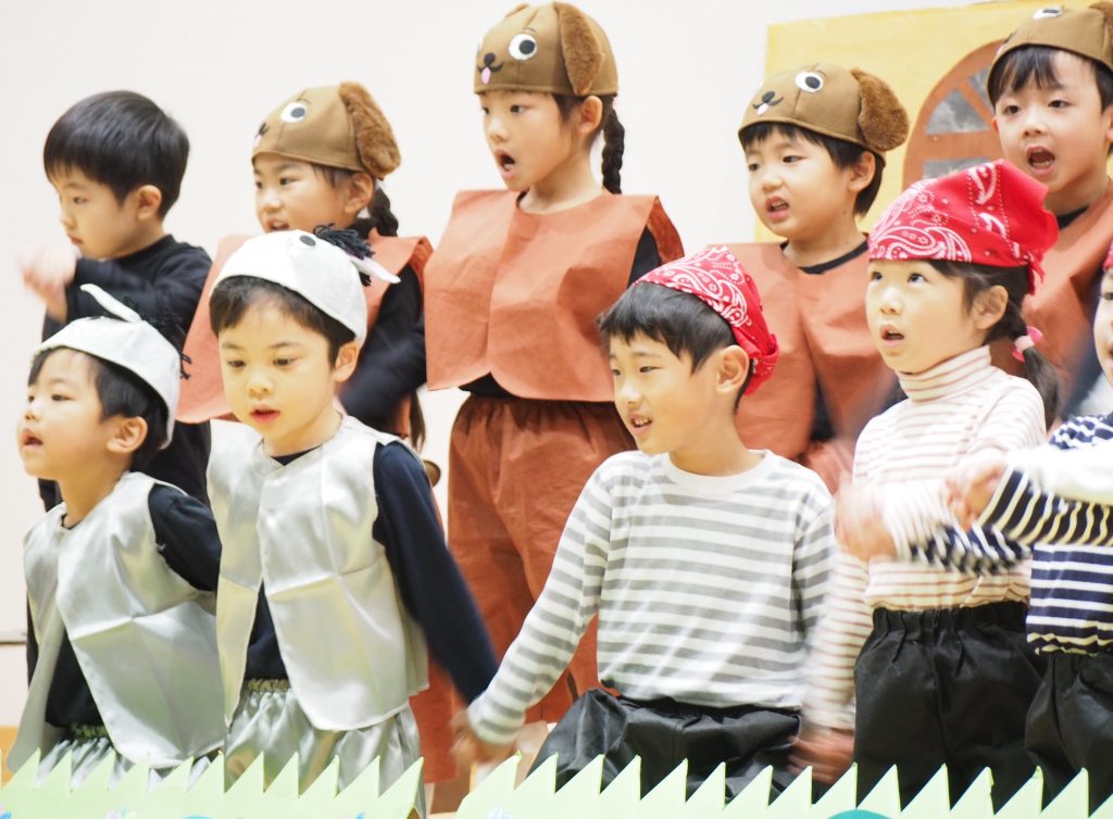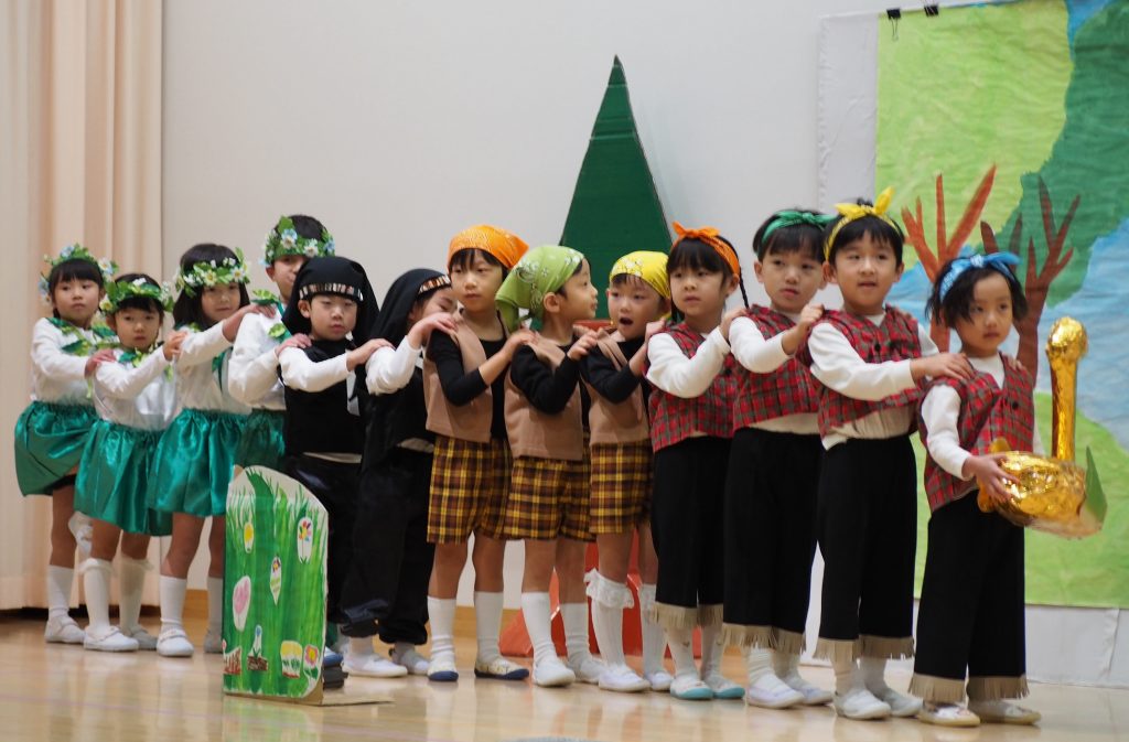 4歳児さんは合奏と手話を交えた歌、そしてはじめて劇に挑戦しました。きりん組は「金のガチョウ」くま組は「ブレーメンの音楽隊」を披露しました。一人一人しっかりと役になりきれていました!
