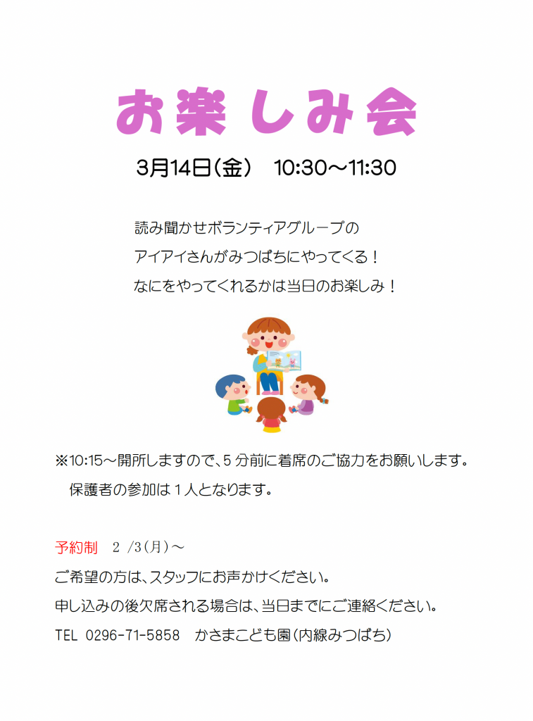 子育て支援センターみつばち 令和6年度3月の支援講座 2025 2/03 子育て支援センターみつばち 3月の支援講座の予約が始まっています。 みなさんの参加をお待ちしております。 子育て支援センターみつばち URLをコピーしました! みつばちの日(豆まき) かさまこども園に鬼さんがやってきたぞ〜👹⚡️!! コメント コメントする コメントをキャンセルコメント ※ 名前 ※ メール ※ サイト 次回のコメントで使用するためブラウザーに自分の名前、メールアドレス、サイトを保存する。 上に表示された文字を入力してください。 Δ