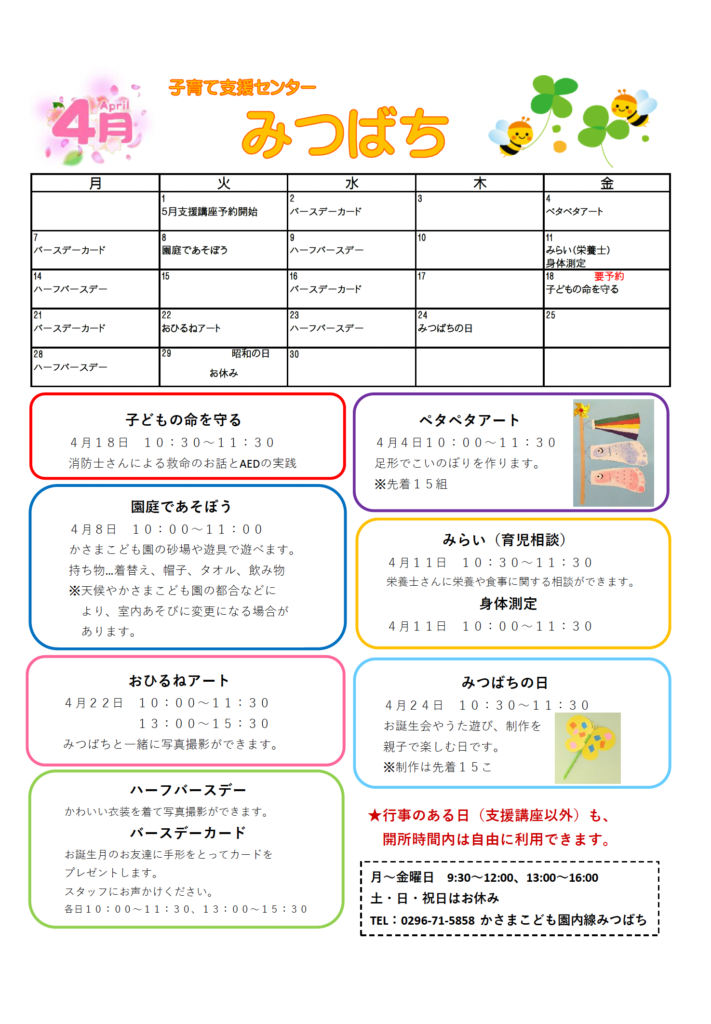 【みつばち】令和7年度 4月の予定 2025 3/25 子育て支援センターみつばち 子育て支援センターみつばち URLをコピーしました! みつばち お楽しみ会 🌸令和6年度卒園式🌸 コメント コメントする コメントをキャンセルコメント ※ 名前 ※ メール ※ サイト 次回のコメントで使用するためブラウザーに自分の名前、メールアドレス、サイトを保存する。 上に表示された文字を入力してください。 Δ