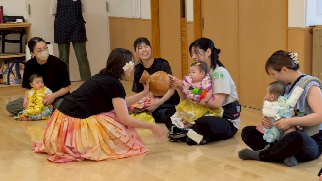 お名前を呼ばれたら、「はあい」とハワイの楽器イプをたたきます。