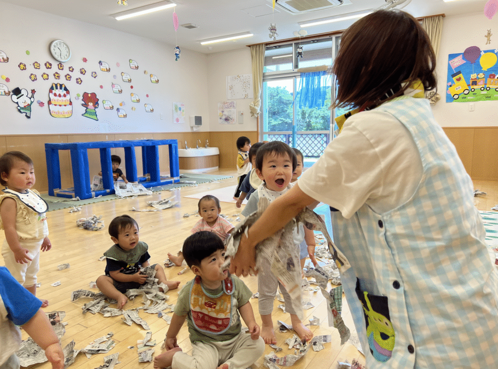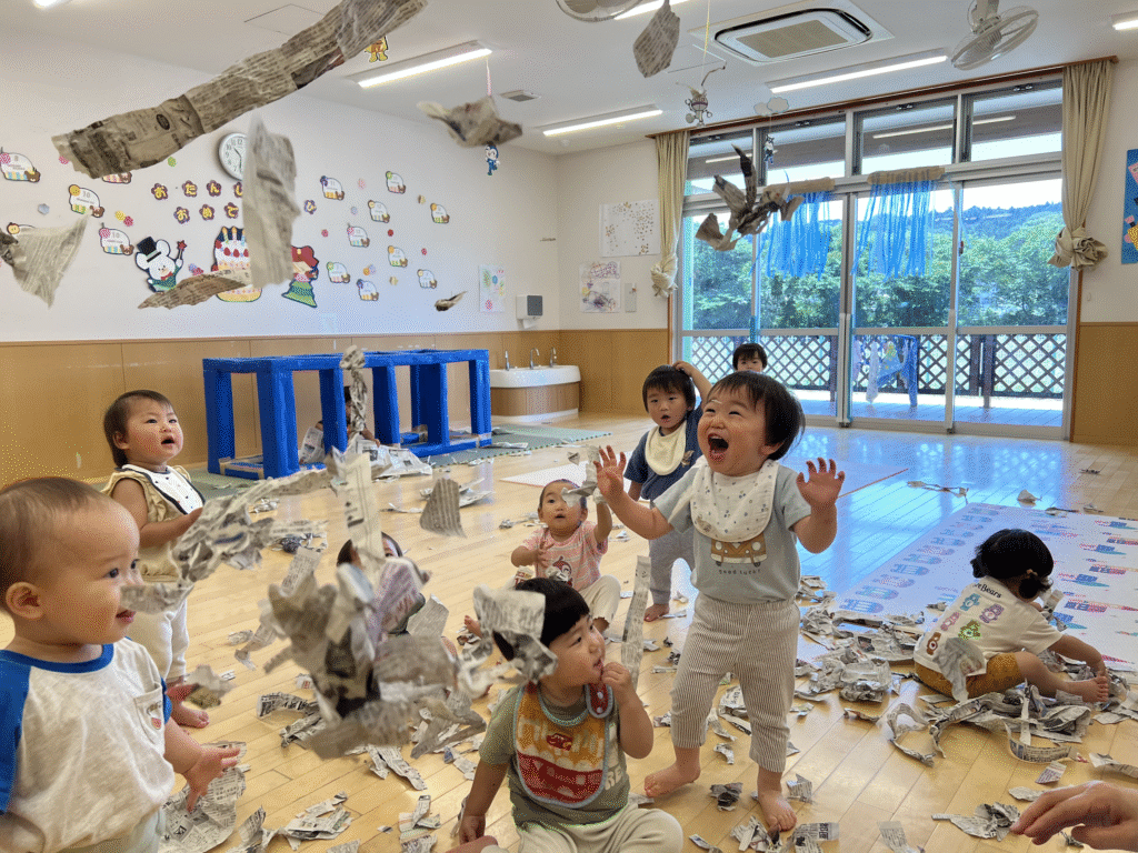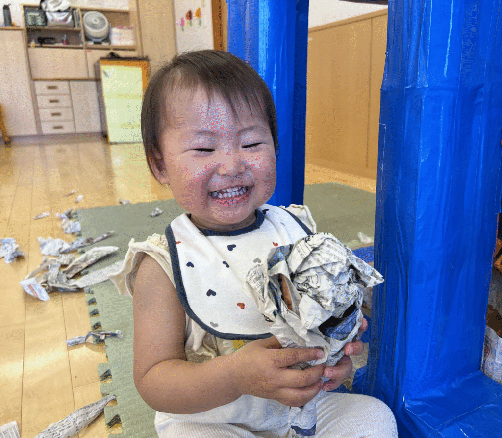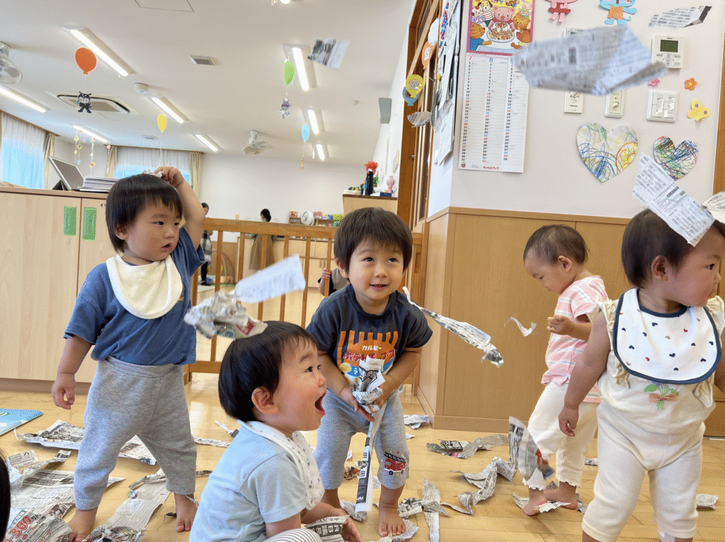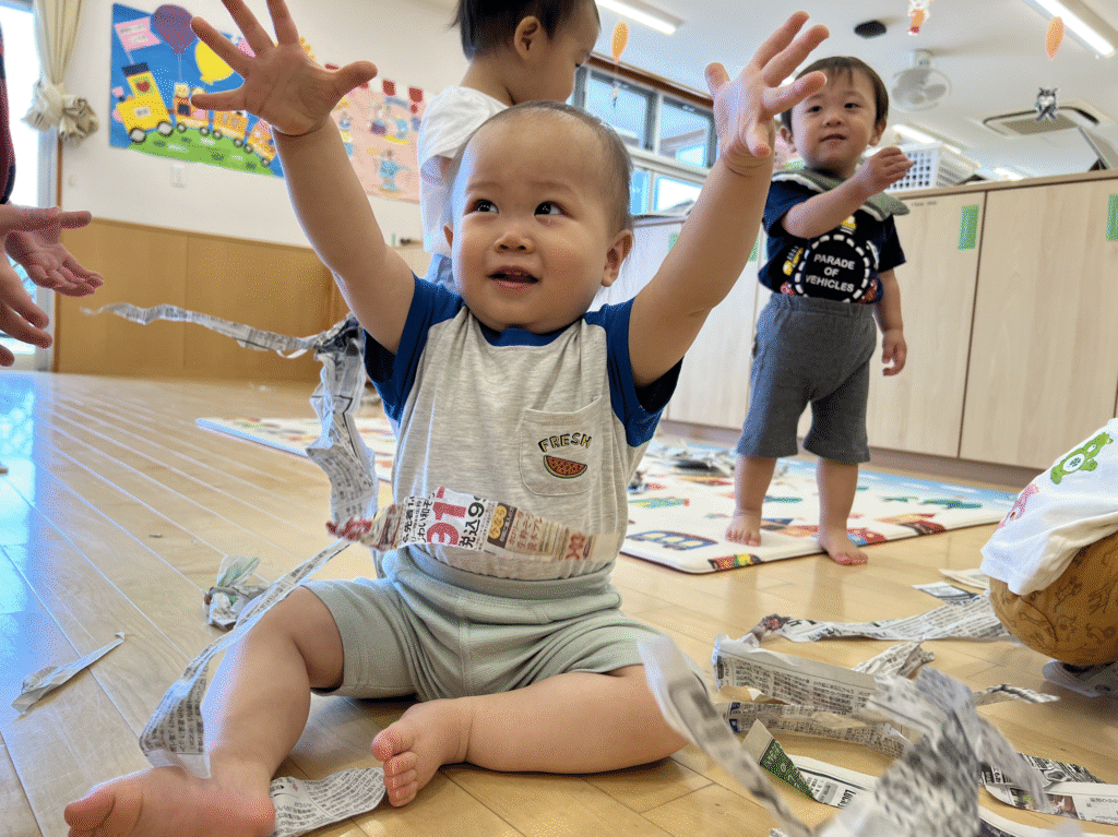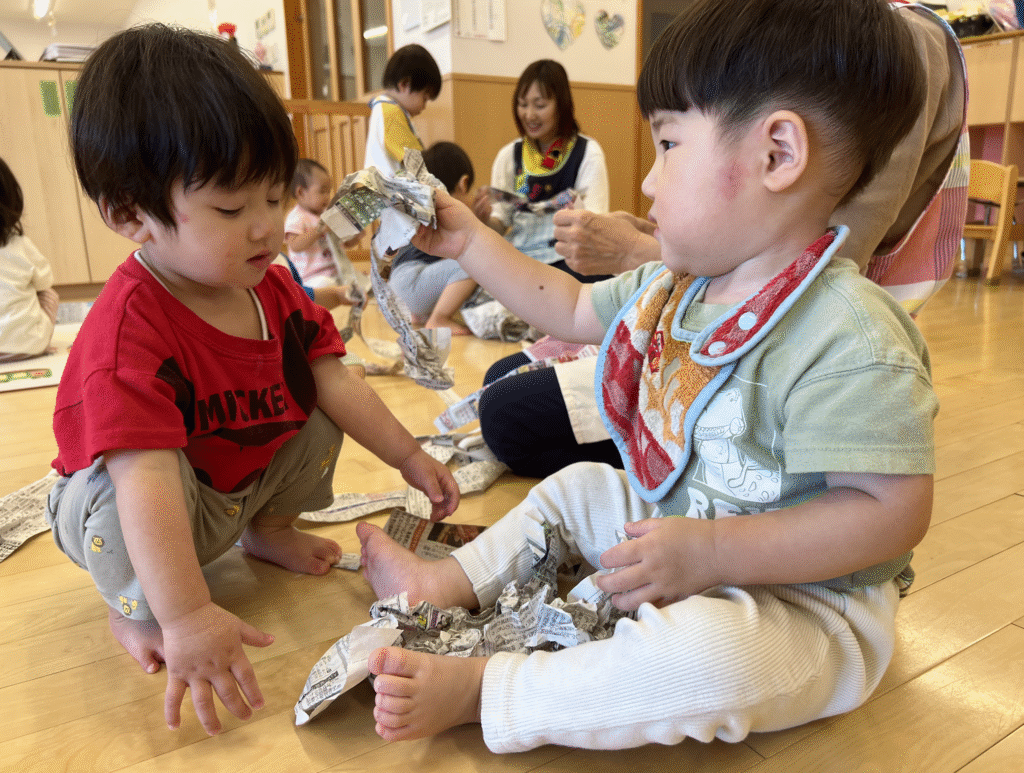 「ビリビリできるかな?どーぞ😊」先生からもらった新聞に興味津々な子どもたちです👀✨