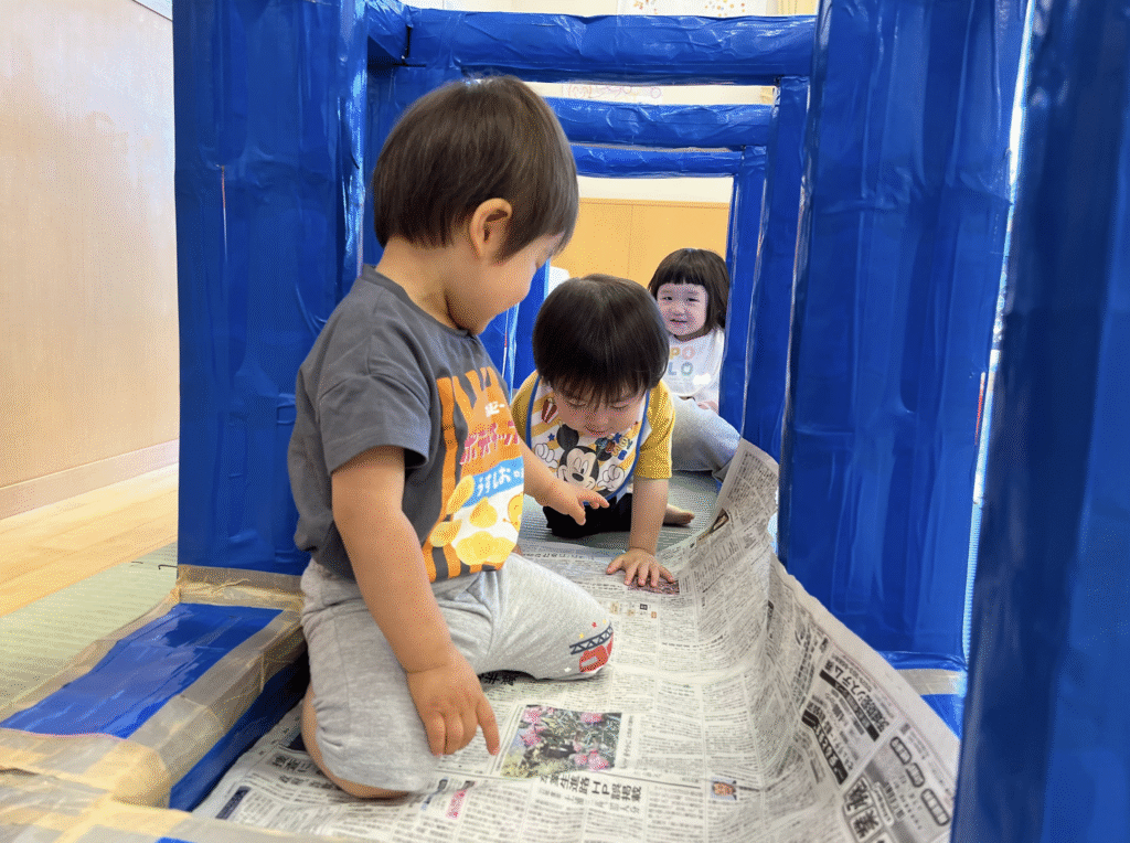 トンネルの中で新聞を敷いて遊んでいる子もいました!カーペットかな?💭