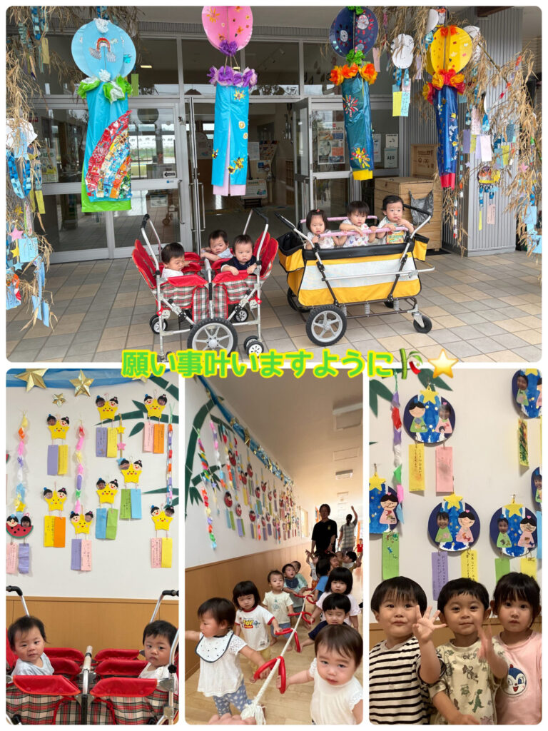 園内にはみんながそれぞれに願いを込めて作った七夕飾りを飾りました!自分の短冊を見つけると、「あったよ!」とうれしそう✨お願い事もお話して教えてくれました♪