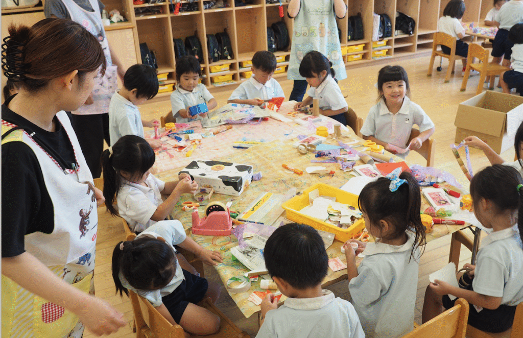 こちらは廃材を使っての自由製作です✂️SDGsの時代!製作を通して資源を大切にする気持ちを育てています😀子ども達の発想力は無限大‼️どんどんアイディアがあふれてきて、みんな夢中になって取り組んでいます。