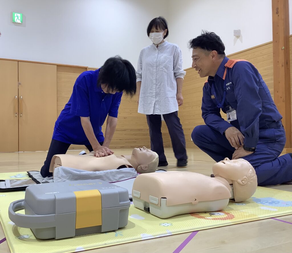 9月2日、3日の2日間 笠間消防署の方を園にお呼びして全職員が救命講習を受講し胸骨圧迫とAEDの使い方を教わりました。