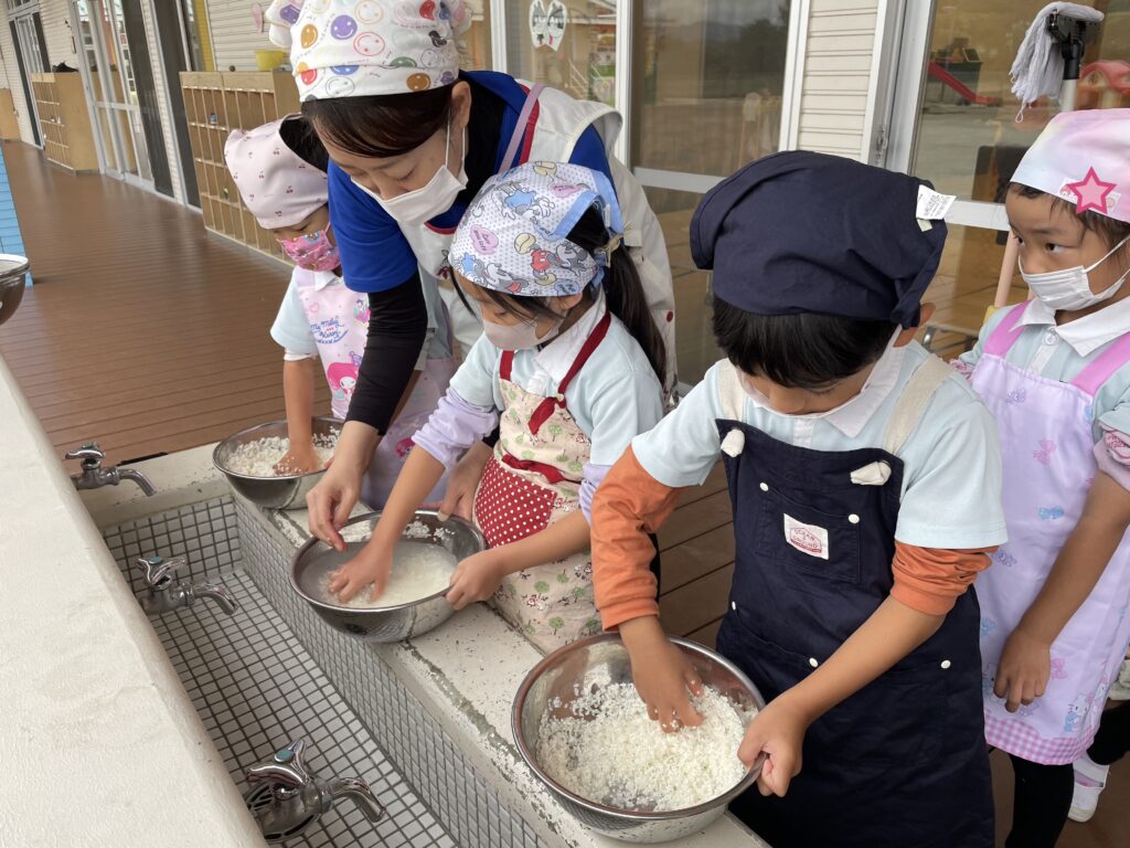 給食室で炊いてもらったお米でおにぎり作りスタートです✨