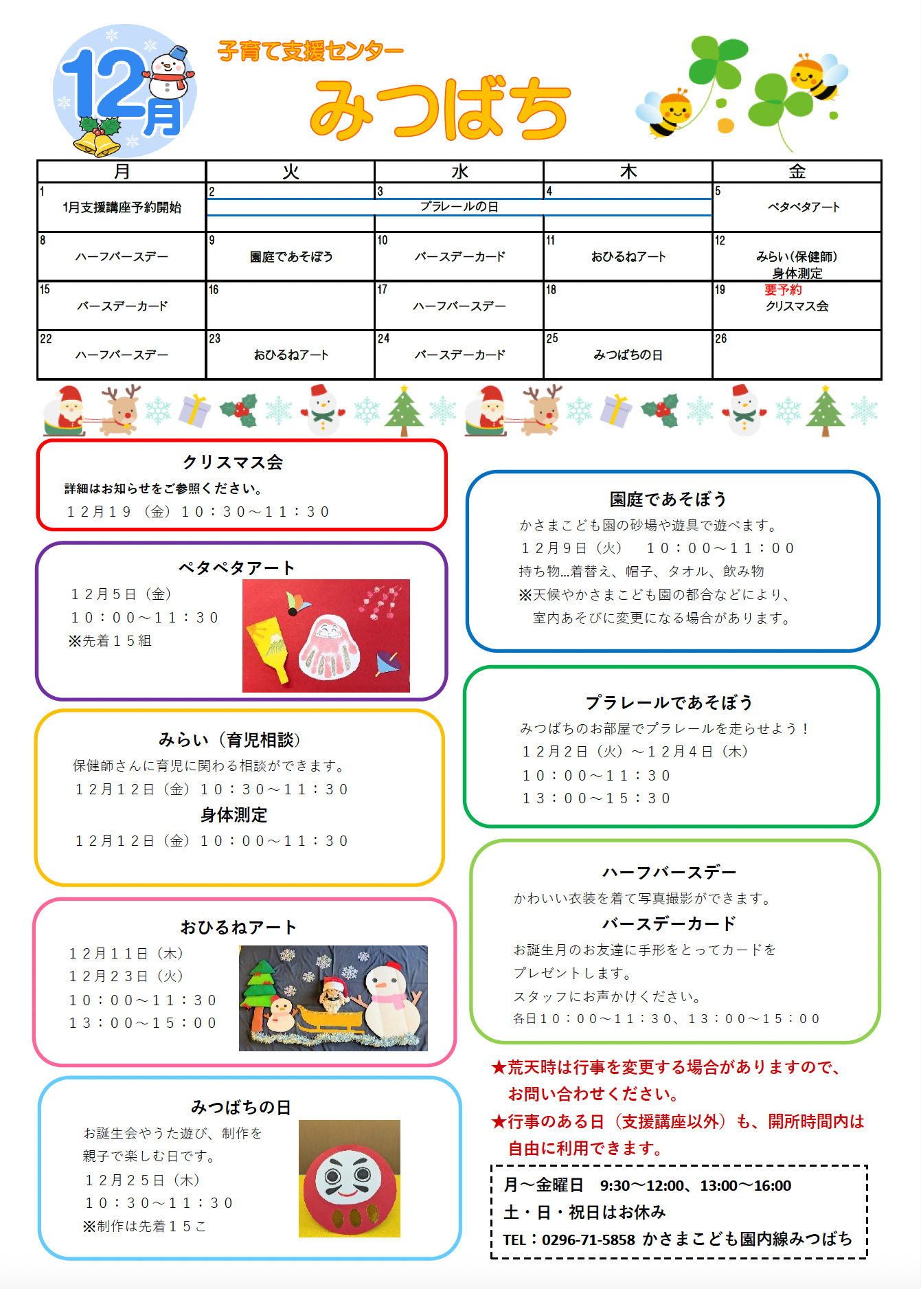【みつばち】令和7年度12月の予定 2025 11/18 子育て支援センターみつばち 子育て支援センターみつばち URLをコピーしました! 【みつばち】親子体操教室 台湾バナナ寄贈 コメント コメントする コメントをキャンセルコメント ※ 名前 ※ メール ※ サイト 次回のコメントで使用するためブラウザーに自分の名前、メールアドレス、サイトを保存する。 上に表示された文字を入力してください。 Δ