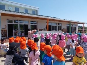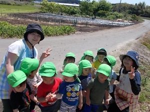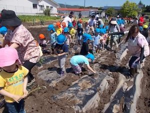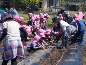 お天気も良くきれいな青空のもと、3才以上児さんで芋苗植えを行いました。今年は『紅あずま』という品種の苗を300本植えました。