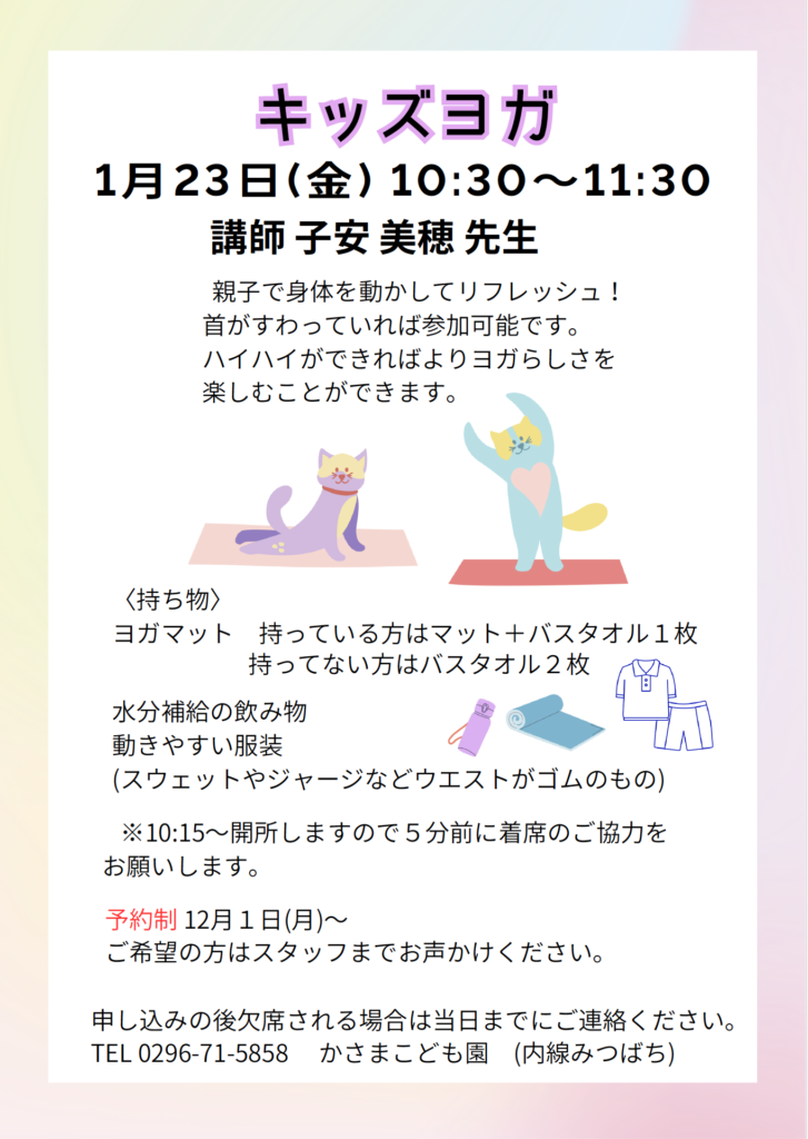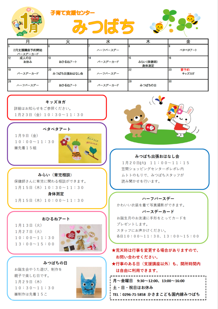 【みつばち】令和7年度1月の予定 2025 12/22 子育て支援センターみつばち 子育て支援センターみつばち URLをコピーしました! 【みつばち】クリスマス会 千切って伸ばして楽しいね♪小麦粉粘土遊び コメント コメントする コメントをキャンセルコメント ※ 名前 ※ メール ※ サイト 次回のコメントで使用するためブラウザーに自分の名前、メールアドレス、サイトを保存する。 上に表示された文字を入力してください。 Δ
