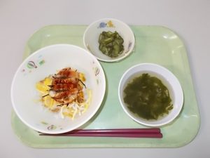 うなぎちらし きゅうりの酢の物 すまし汁(えのき・かまぼこ・みつば)。